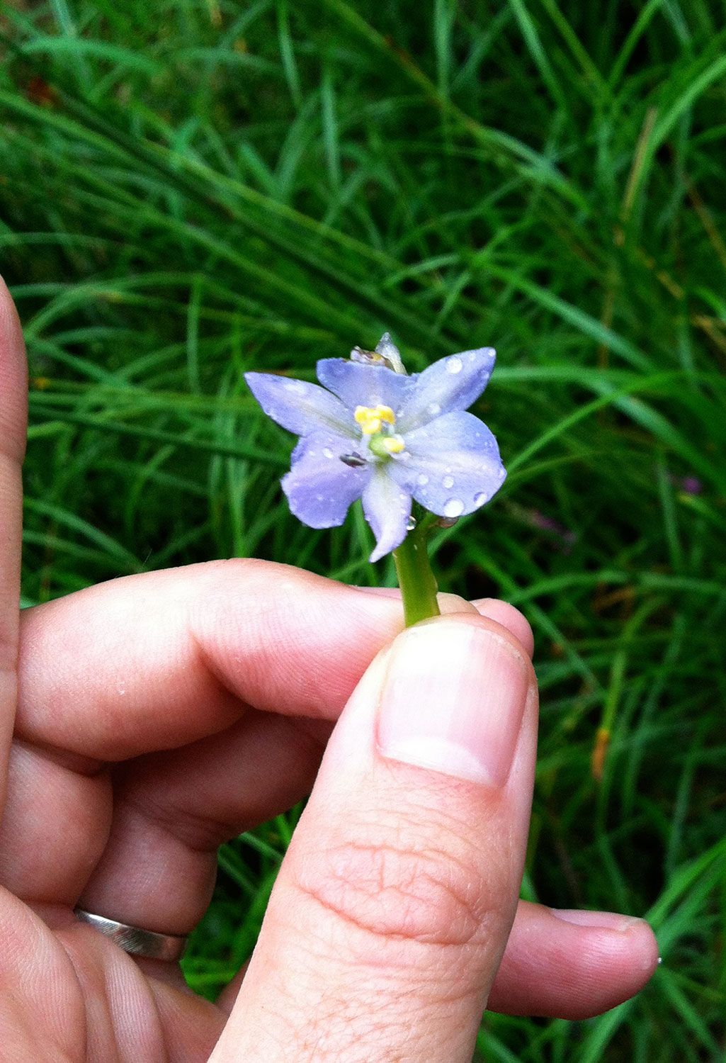 , of 6 tepals in 2 whorls of 3, purple, blue, or white. Dispersal by numerous seeds.