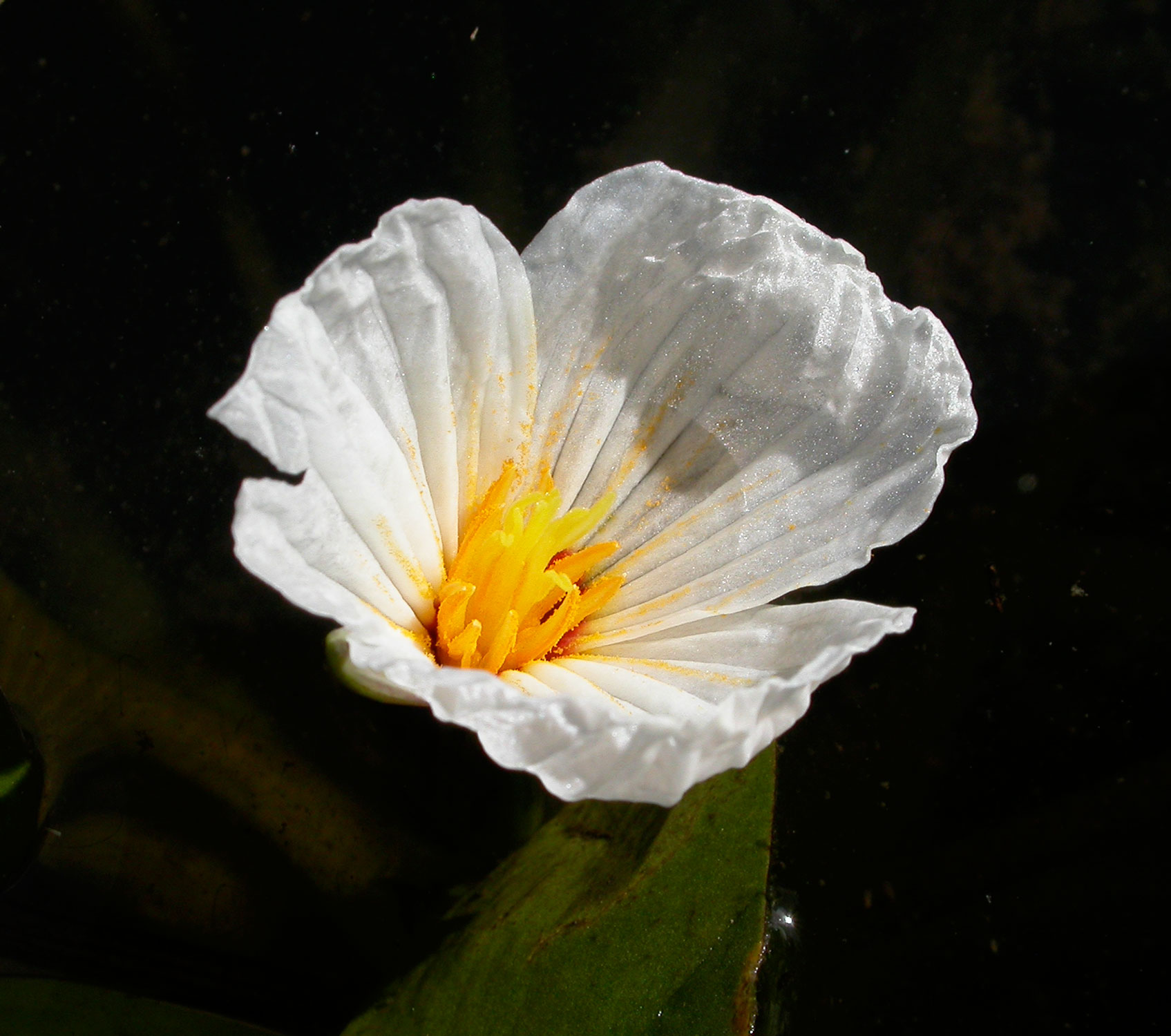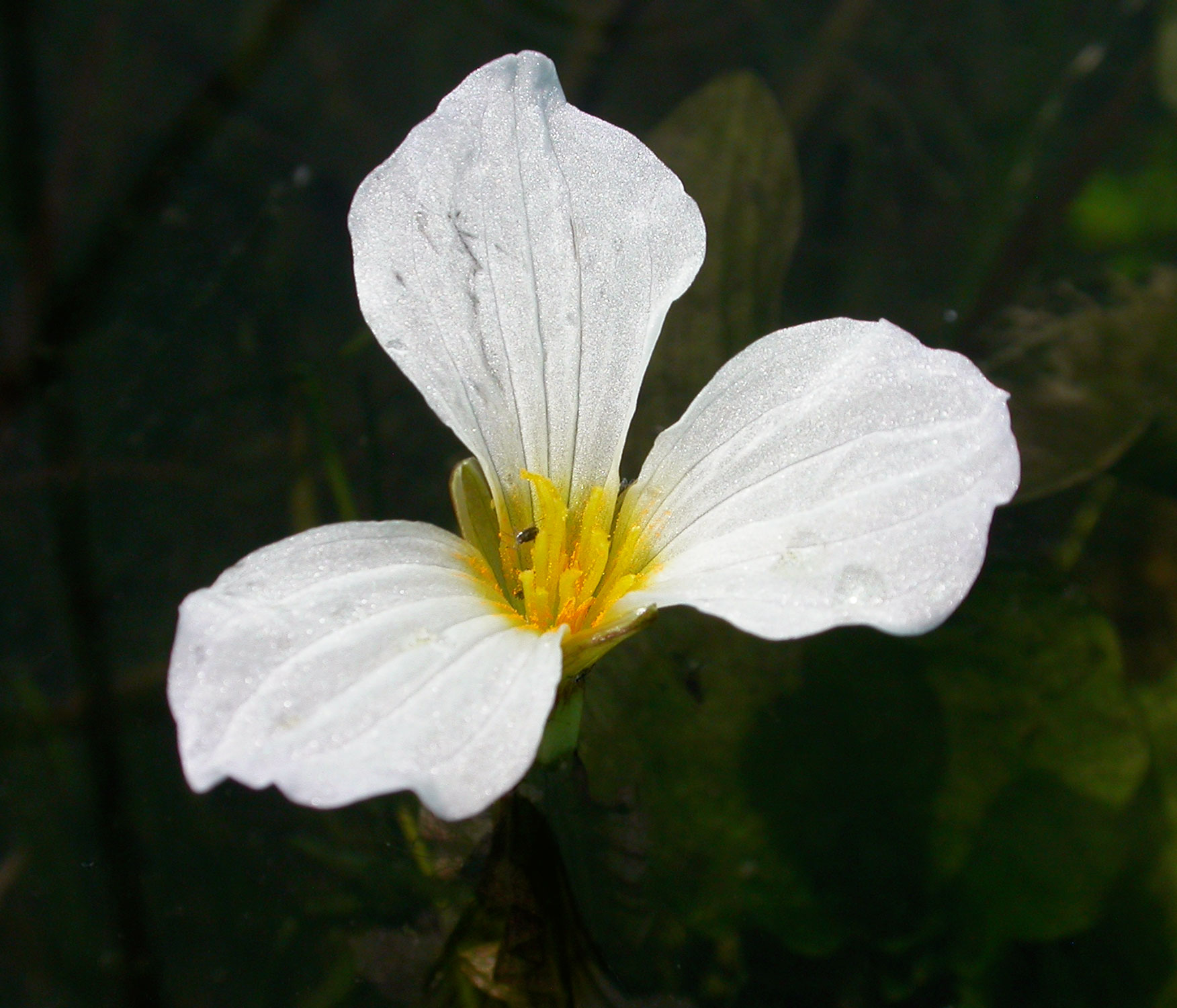 margins in mature plants, lack of floating leaves, and white flowers with yellow center.