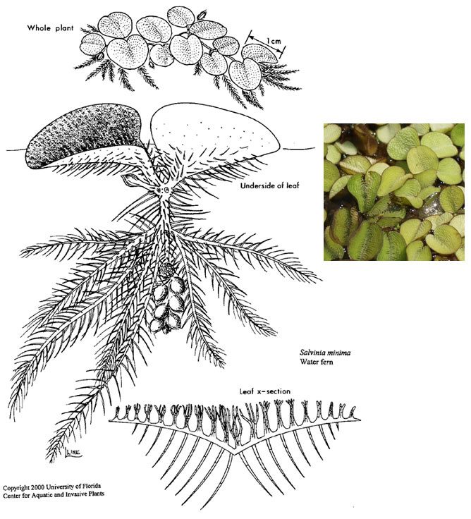 and photosynthetic while a third leaf is root-like and hangs below in the water column. Sporocarps are produced as a hanging cluster or in rows in the water column. Identification of members of the S. auriculata complex is based on the presence of 'bird-cage' or 'baby-rattle' shaped hairs on the upper surface of floating leaves. Other Salvinia species have the terminalterminal: