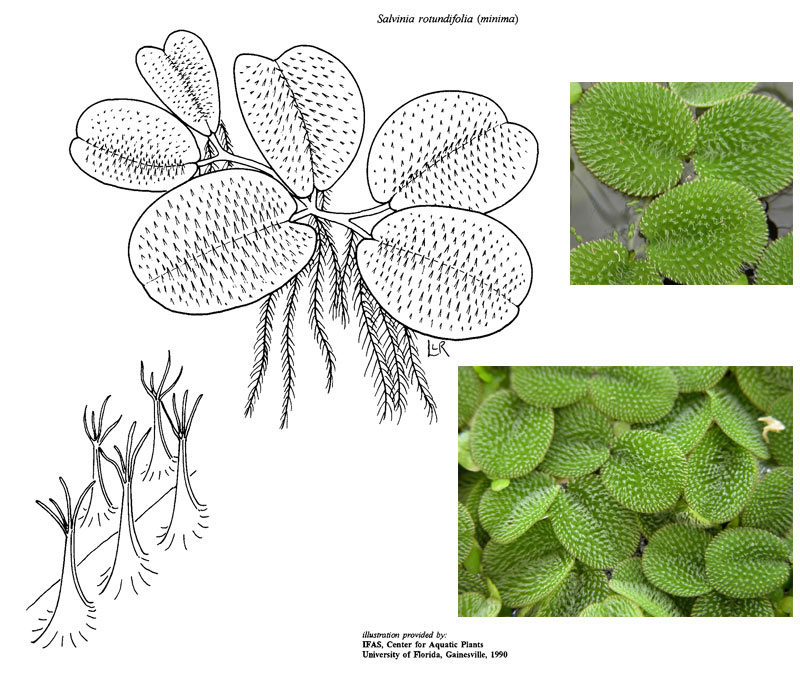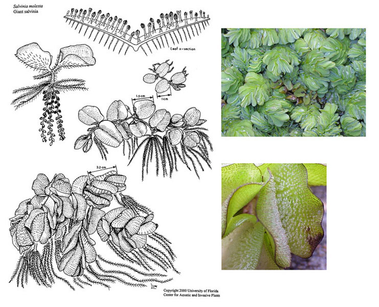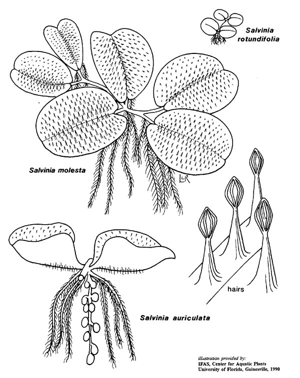 Identification: Salvinia auriculata complex is a group of closely related neotropical species that is distinguished by the shared feature of eggbeater type hairs. The members include S. auriculata Aubl., S. biloba Raddi, S. herzogii de la Sota, and S. molesta. Although subtle vegetativevegetative: