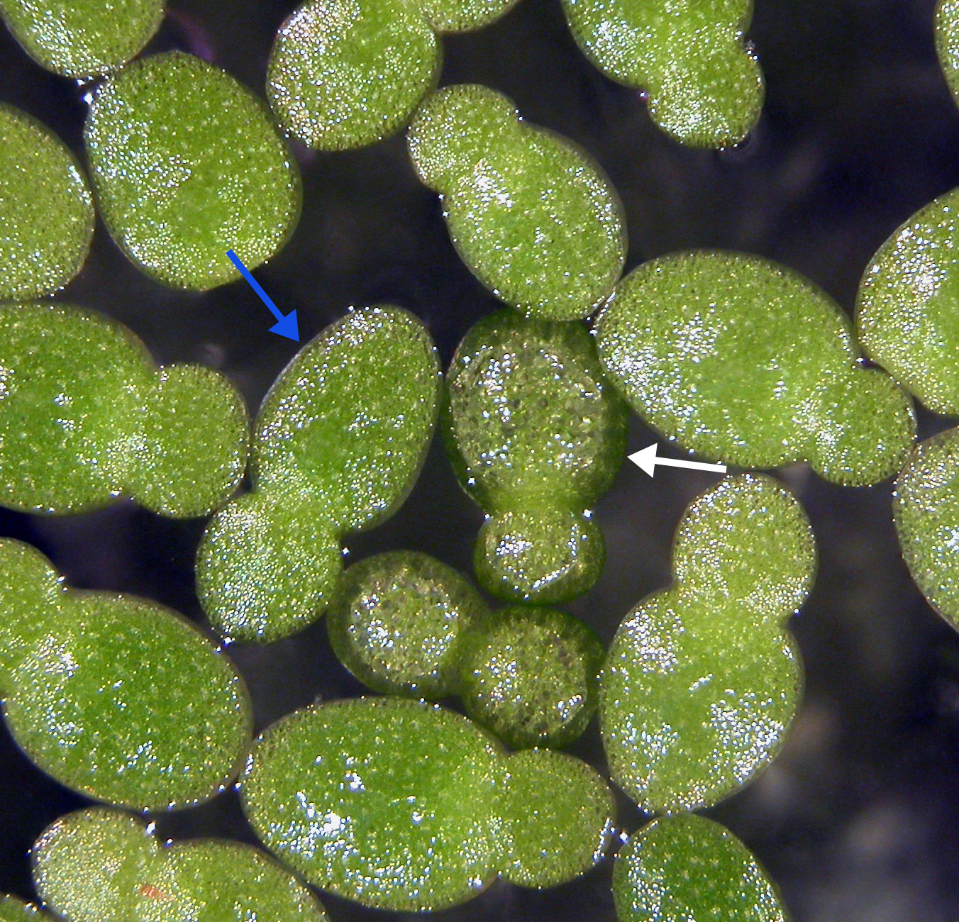 Minute (rarely exceeding 1 mm), free-floating on or just below water surface. Reduced plant body, undifferentiated into stem and leaf. Roots absent. Fronds broadly ovateovate:
