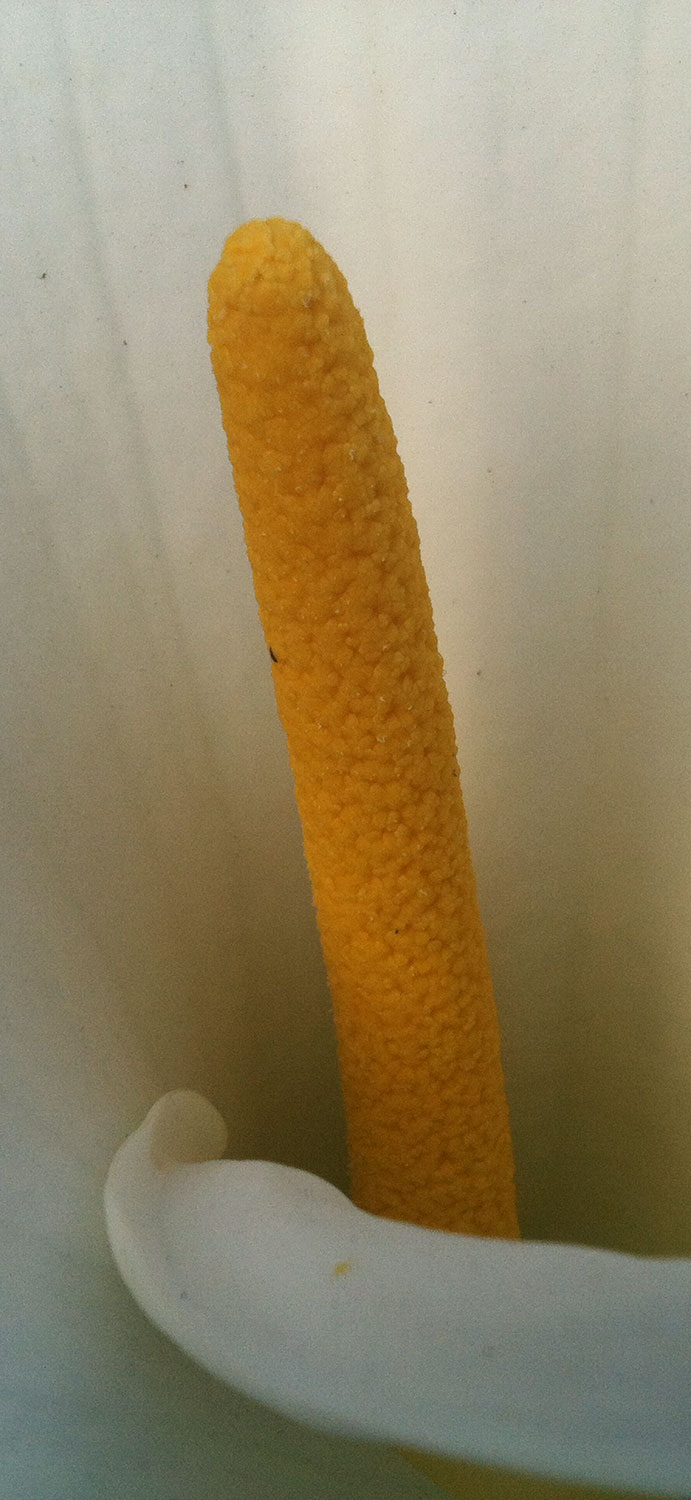 large, showy, subcylindrical to funnel-shaped, white (Z. aethiopica), but variously colored in cultivated forms of this species; spadixspadix: