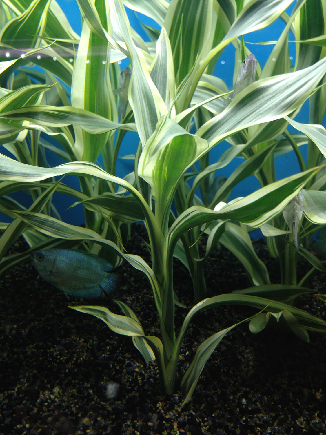 Dracaena consists of over 100 species. Dracaena sanderiana is utilized in aquaria because it can tolerate extended periods of submersion. This species is most frequently grown indoors hydroponically as an ornamental called 'Lucky Bamboo'; although several common names for the genus include the word "bamboo" (a grass), D. sanderiana is not a bamboo.