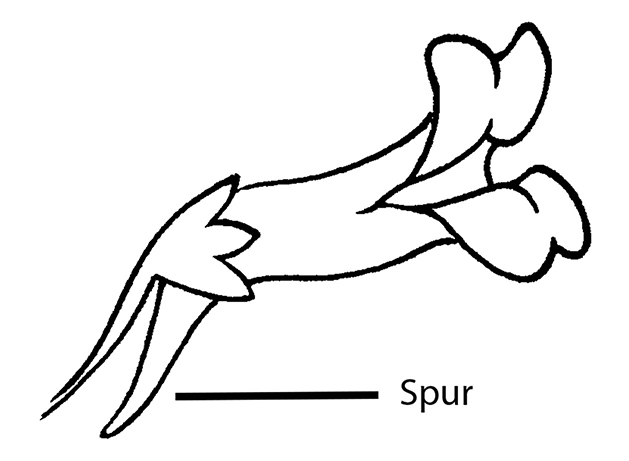 (n) a usually slender, hollow projection formed by the fused bases of the lower petals in some flowers notably of the genus Utricularia; a sac-like projection or extension of a petal or sepal; a short, fruit-bearing stalk