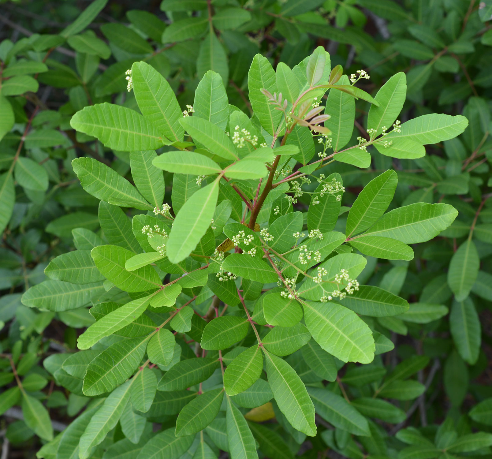 Large shrub. Bark gray, smooth, often becoming furrowed with age; branches wide-spreading young stems finely hairy, with small white lenticels; sap aromatic (‘peppery’ or ‘turpentine’), resinous, turning black when exposed to air. Leaves alternatealternate: