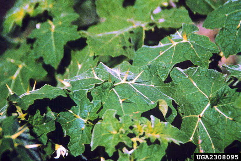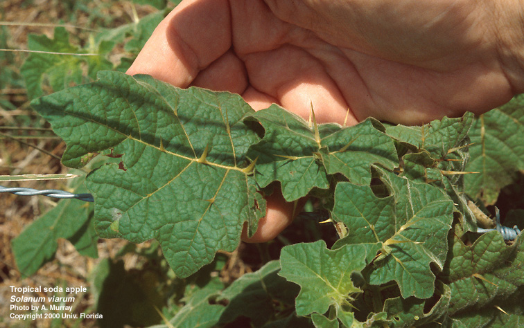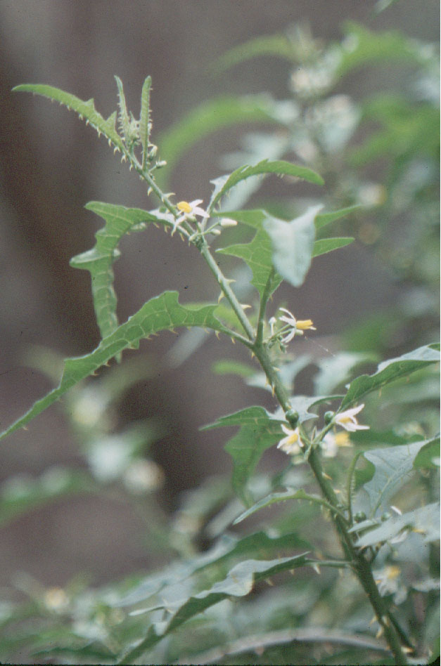 Identification: S. tampicense is a vinelike, sprawling, prickly shrub with stems up to 5 m long. It grows as impenetrable thickets and can form large stands of many acres. S. tampicense differs from other Solanum species by its shrub-like to climbing habit, white flowers, and leaves with sinuate marginmargin: