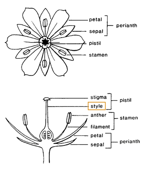 (n) in a flower, the narrow and elongated part of the pistil between the stigma and the ovary