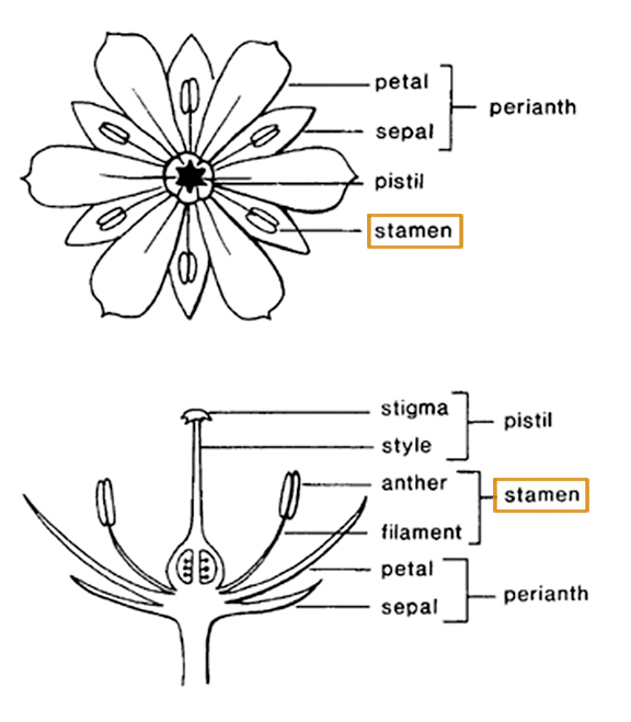 (n) the male reproductive organ in a flower, consisting of a pollen-bearing anther and a filament