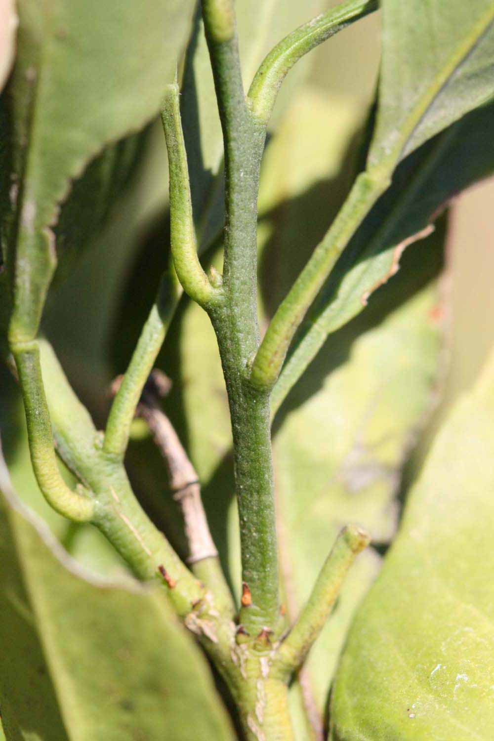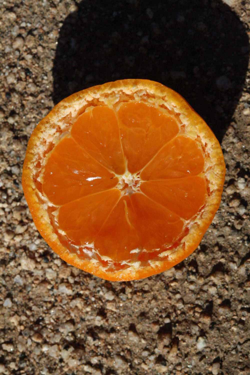 Crown compact or dense, not weeping. First-year twig surface glabrous; second- or third-year twig surface striate; thorns absent or not persistent; prickles absent or not persistent. Petiole glabrous, length medium length, wings narrow and adjoining the blade. Leaflets one, margin bluntly toothed, shade leaflet blades weakly conduplicate, sun leaflet blades weakly conduplicate. Scent of crushed leaflets mandarin-like. Fruit broader than long; rind yellow (7-10), yellow-orange (11), orange (12), or red-orange (13); rind texture slightly rough (4-5); firmness leathery; navel absent; flesh orange; taste acidic-sweet.