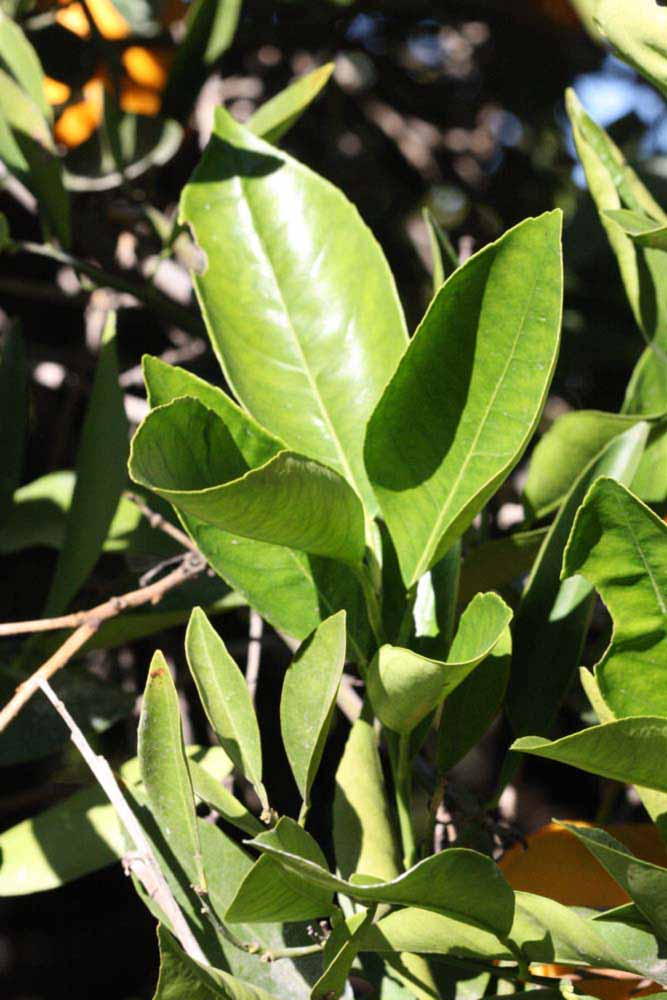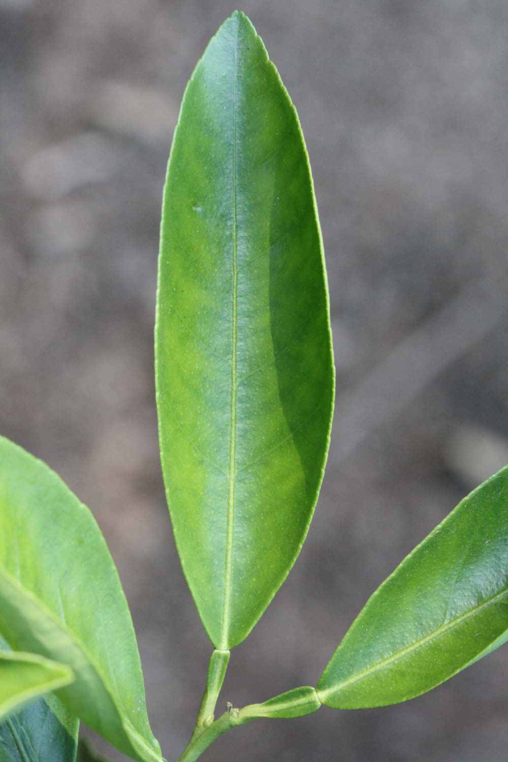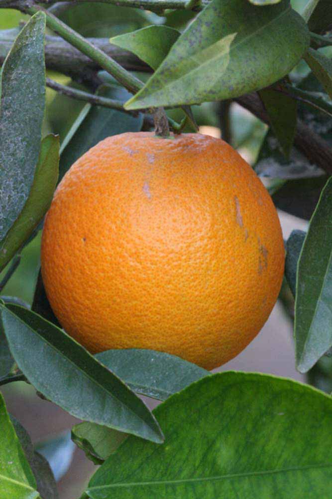 Crown compact or dense, not weeping. First-year twig surface glabrous; second- or third-year twig surface striate; thorns absent or not persistent; prickles absent or not persistent. Petiole glabrous, length medium, wings narrow and adjoining the blade. Leaflets one, margins bluntly toothed, shade leaflet blades weakly conduplicate, sun leaflet blades weakly conduplicate. Scent of crushed leaflets sweetly orange-like. Fruit as broad as long or longer than broad; rind yellow (7-10), yellow-orange (11), orange (12), or red-orange (13); rind texture slightly rough (4-5); firmness leathery; navel present; flesh orange; taste acidic-sweet.