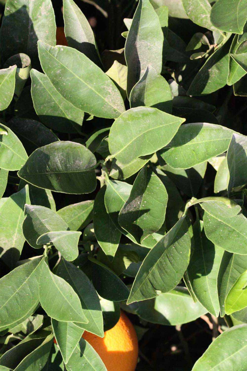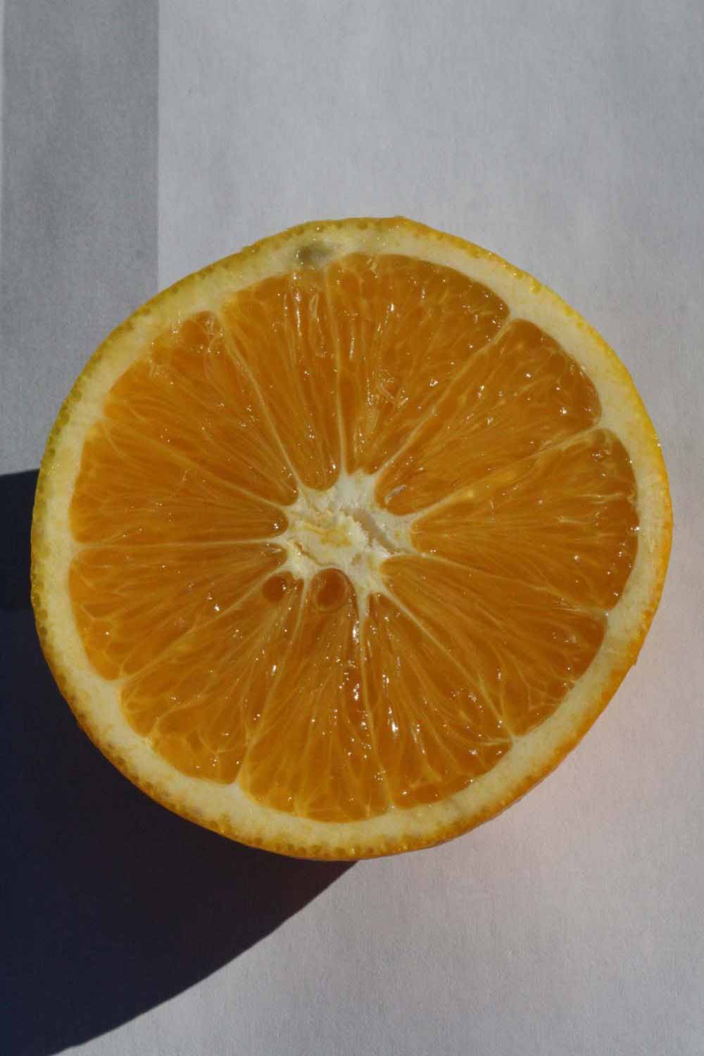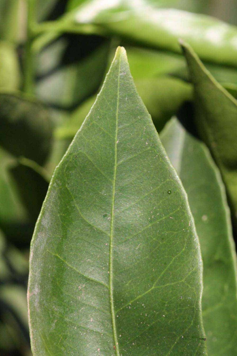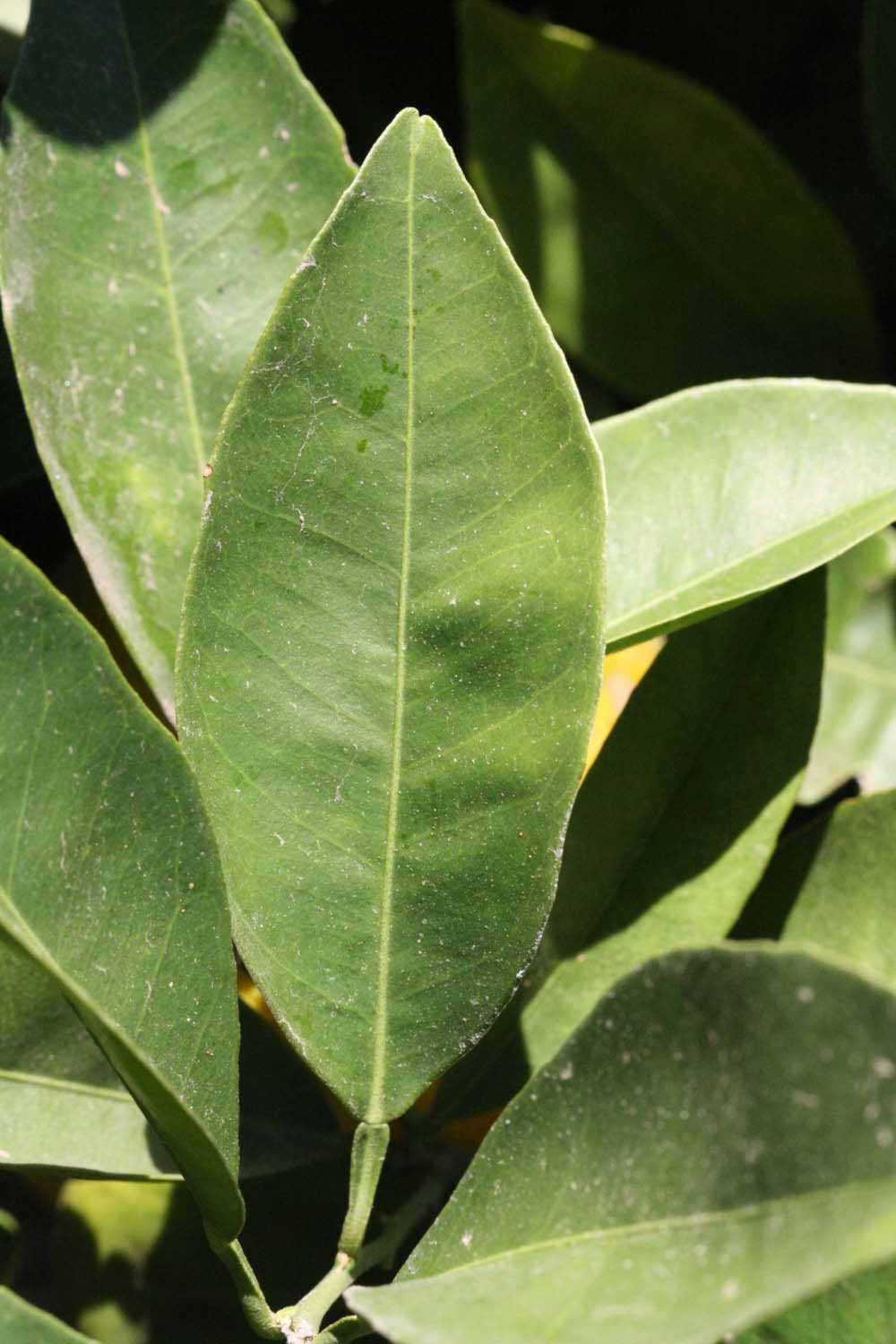 Crown compact or dense, not weeping. First-year twig surface glabrous; second- or third-year twig surface striate; thorns absent or not persistent; prickles absent or not persistent. Petiole glabrous, length medium, wings narrow and adjoining the blade. Leaflets one, margins entire (by misinterpretation) or bluntly toothed, shade leaflet blades weakly conduplicate, sun leaflet blades weakly conduplicate. Scent of crushed leaflets sweetly orange-like. Fruit as broad as long or longer than broad; rind yellow-orange (11), orange (12), or red-orange (13); rind texture slightly rough (4-5); firmness leathery; navel present; flesh orange; taste acidic-sweet.