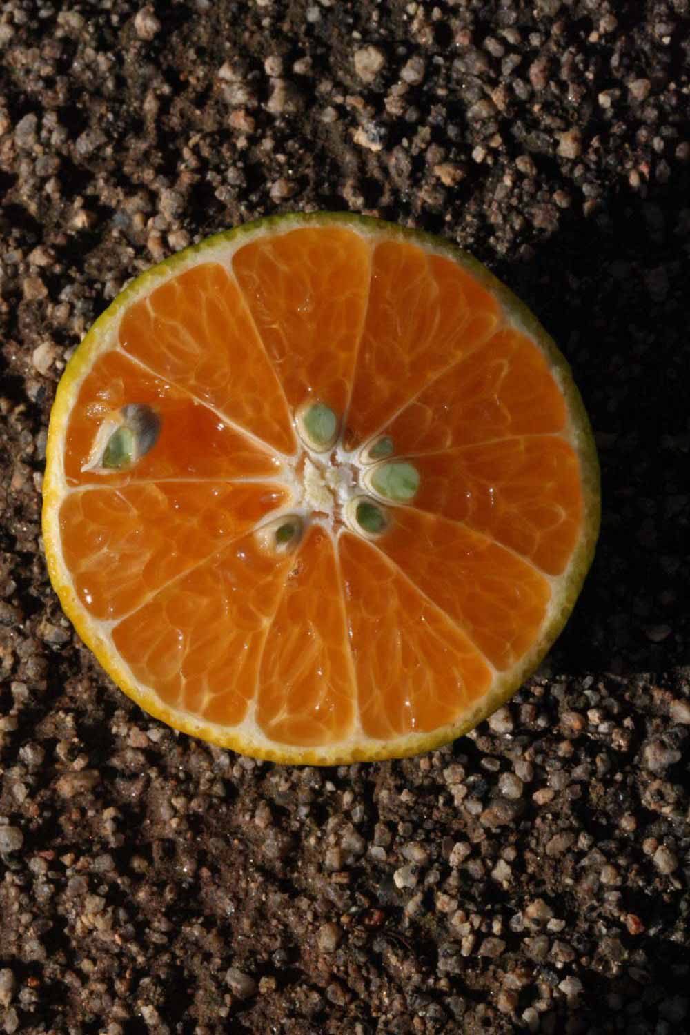 Crown compact or dense, not weeping. First-year twig surface glabrous; second- or third-year twig surface striate; thorns absent or not persistent; prickles absent or not persistent. Petiole glabrous, length short or medium, wings absent. Leaflets one, margins bluntly toothed, shade leaflet blades flat or weakly conduplicate, sun leaflet blades weakly conduplicate. Scent of crushed leaflets mandarin-like. Fruit broader than long; rind yellow (7-10), yellow-orange (11), or orange (12); rind texture smooth (1-3) or slightly rough (4-5); firmness leathery; navel absent; flesh orange; taste acidic-sweet.