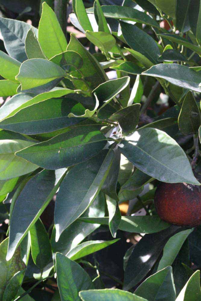 Crown compact or dense, not weeping. First-year twig surface glabrous; second- or third-year twig surface striate; thorns absent or not persistent; prickles absent or not persistent. Petiole glabrous, length medium, wings narrow or medium, adjoining the blade. Leaflets one, margin entire (by misinterpretation) or bluntly toothed, shade leaflet blades weakly conduplicate, sun leaflet blades weakly conduplicate. Crushed leaflet scent sweetly orange-like. Fruit as broad as long or longer than broad; rind yellow (7-10), yellow-orange (11), orange (12), or red-orange (13); rind texture slightly rough (4-5); firmness leathery; navel present; flesh orange; taste acidic-sweet.