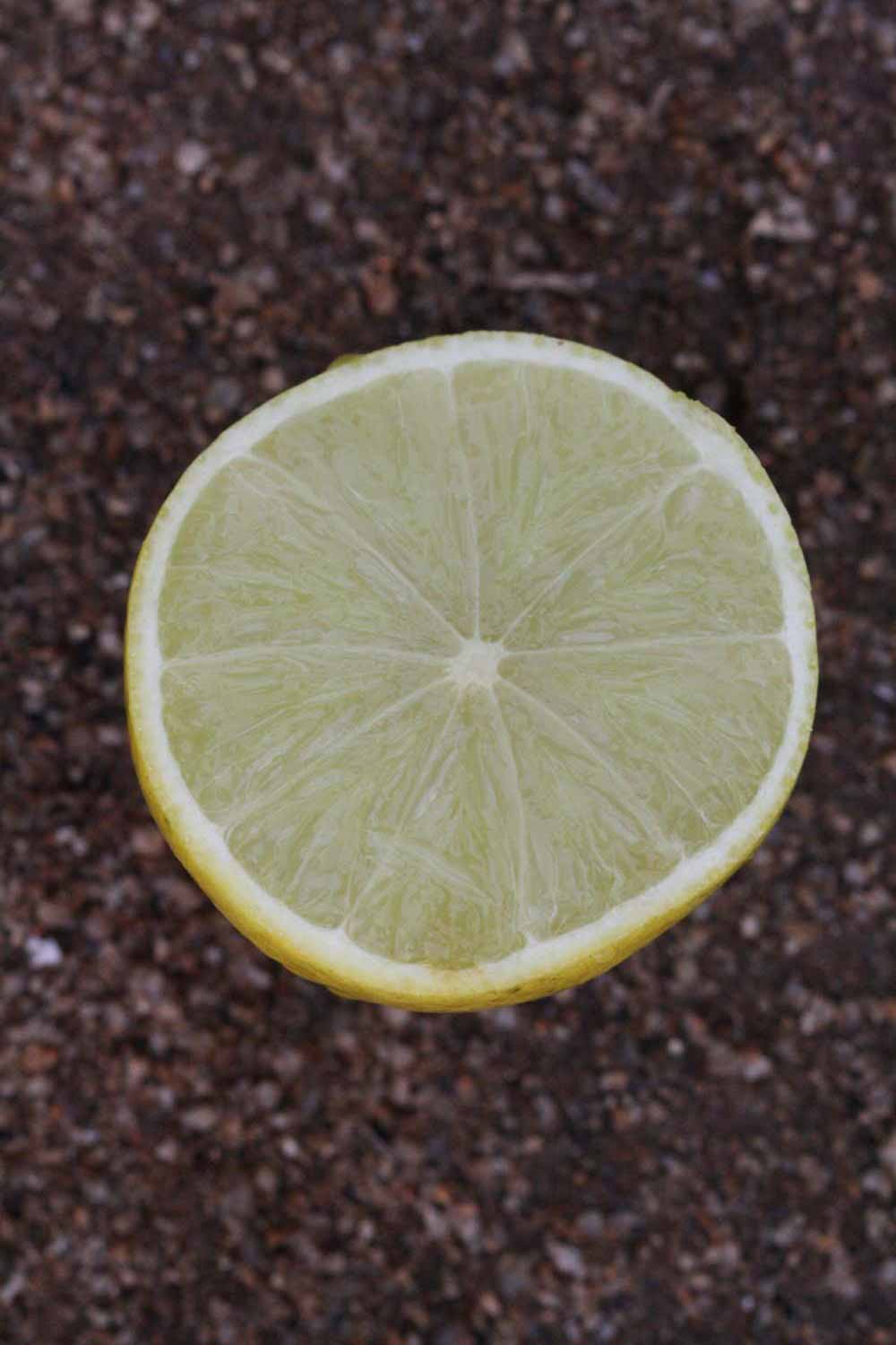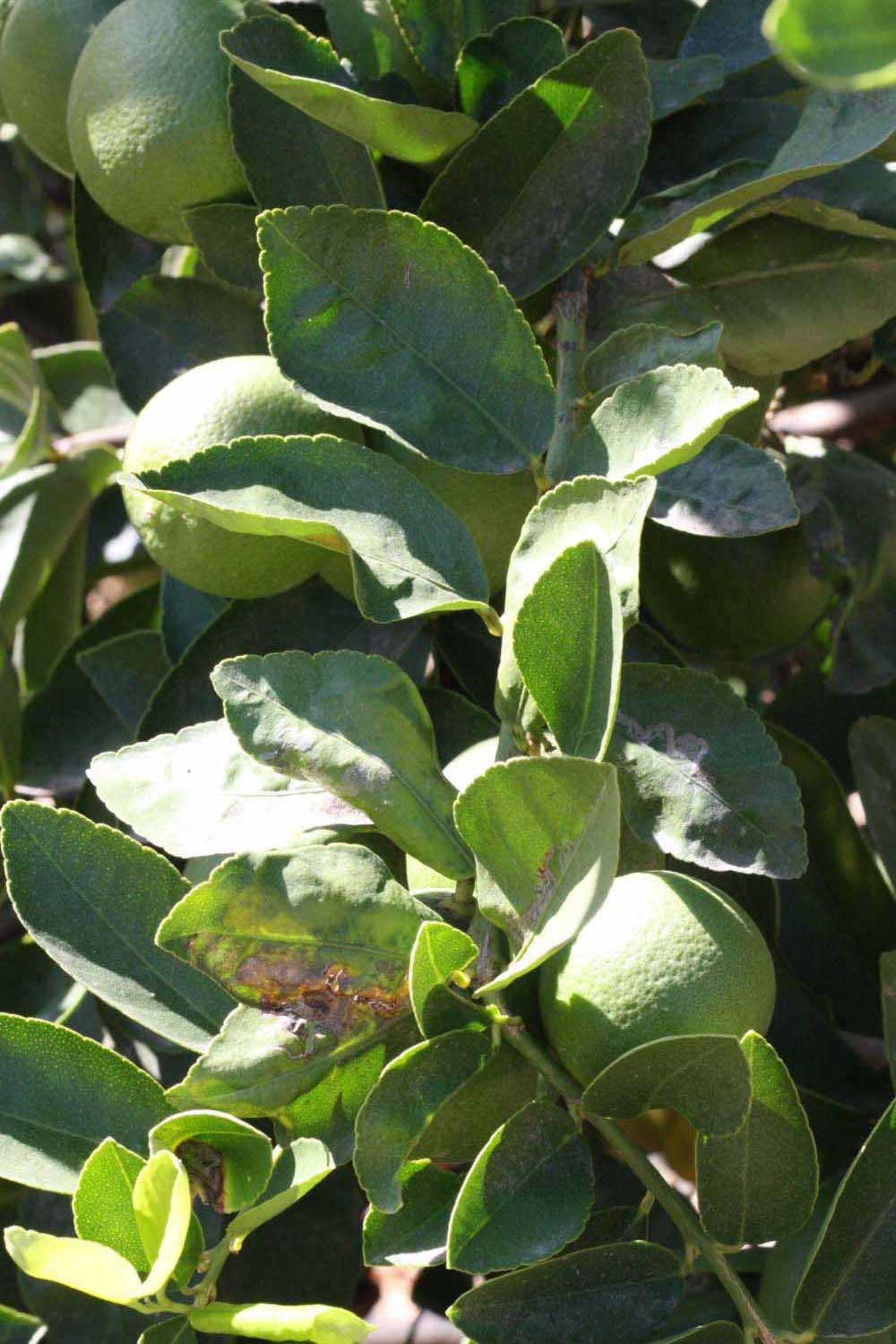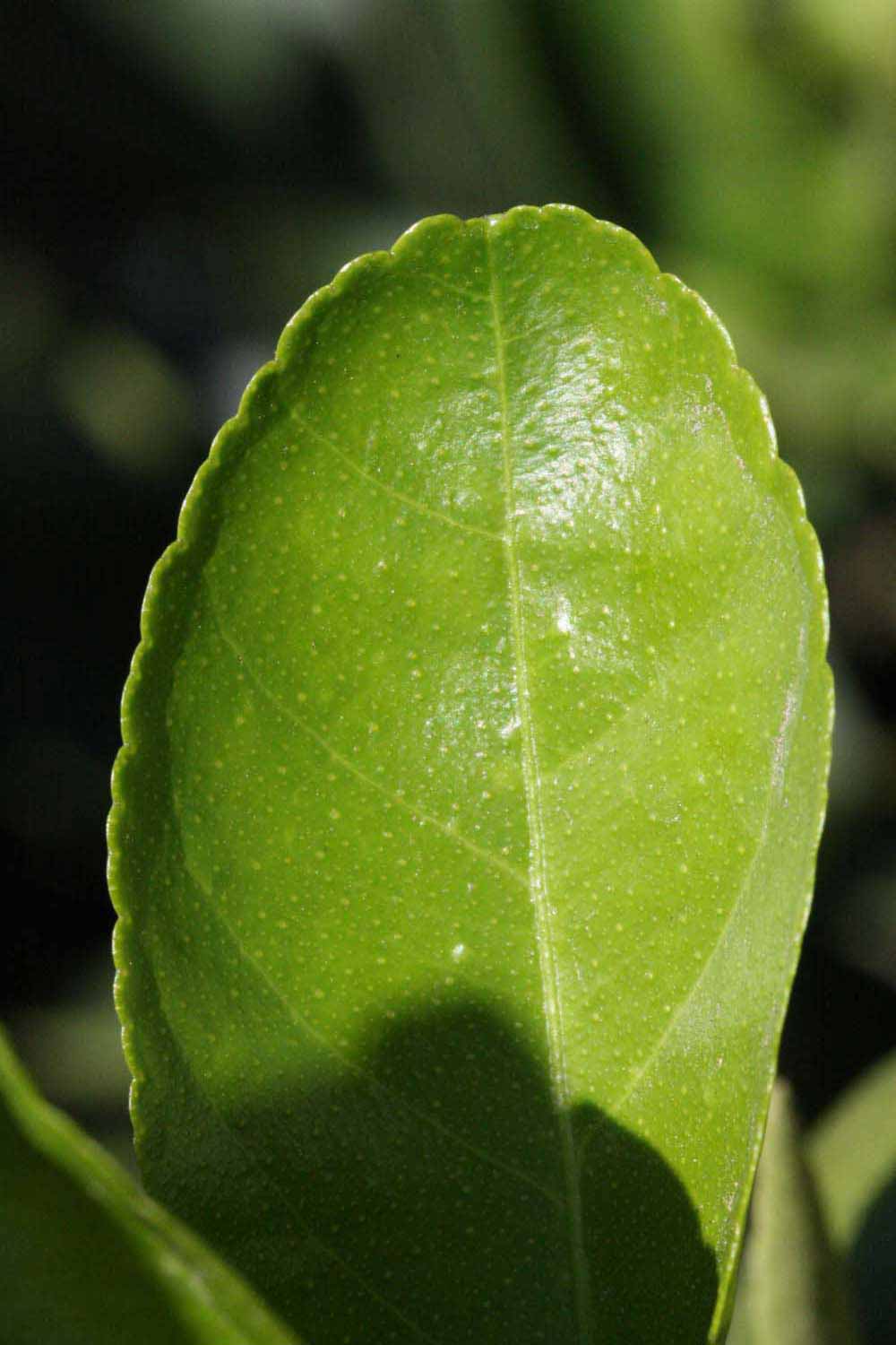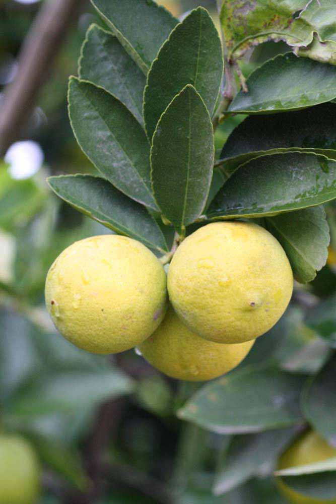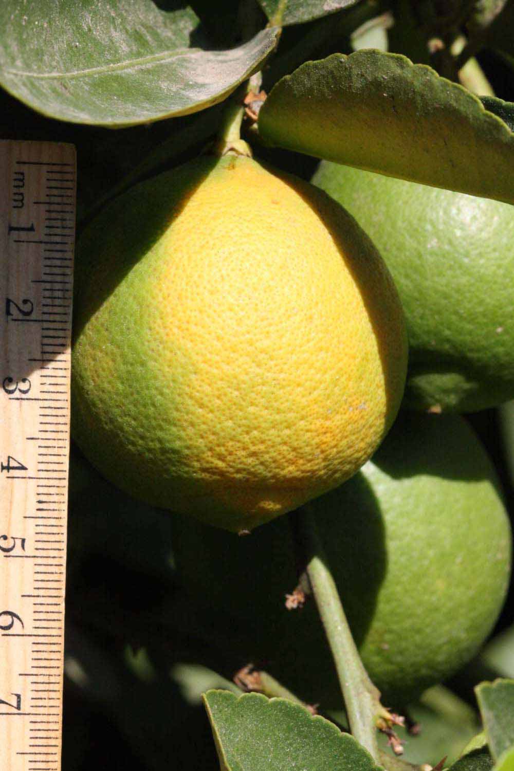 Crown compact or dense, not weeping. First-year twig surface glabrous; second- or third-year twig surface striate; thorns absent or not persistent; prickles absent or not persistent. Petiole glabrous, length short, wings absent. Leaflets one, margins crenate/crenulate or bluntly toothed, shade leaflet blades weakly conduplicate, sun leaflet blades weakly or strongly conduplicate. Scent of crushed leaflets freshly lemon-like. Fruit as broad as long or longer than broad, rind green-yellow (6), yellow (7-10), or yellow-orange (11); rind texture slightly rough (4-5); firmness leathery; navel absent; flesh green/greenish; taste sour.