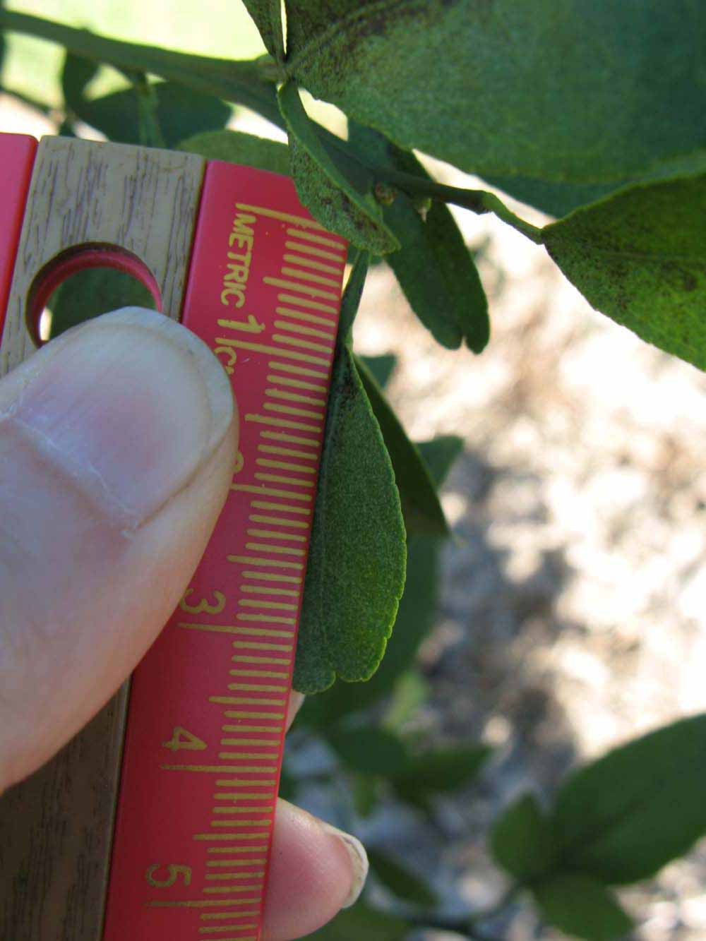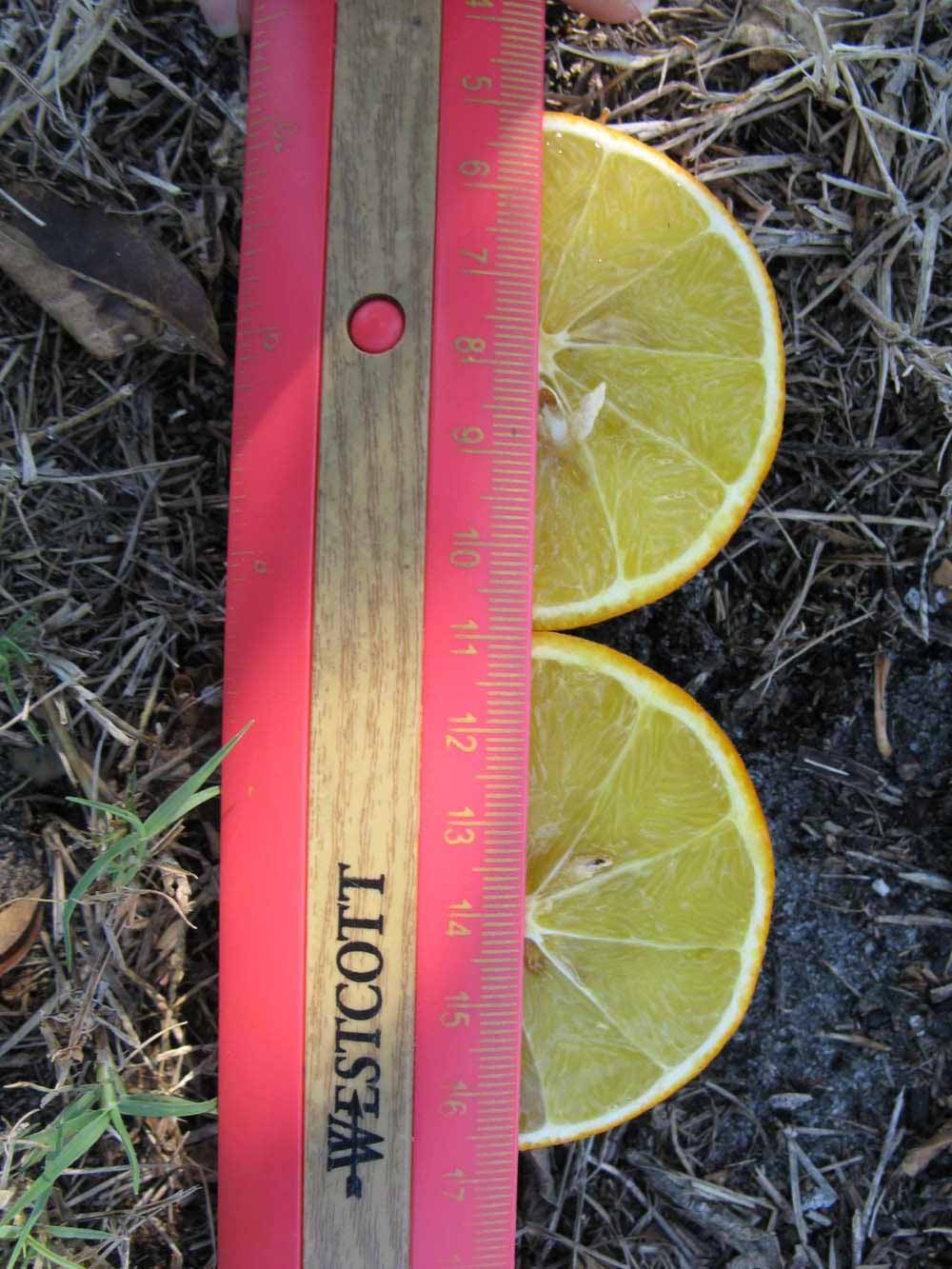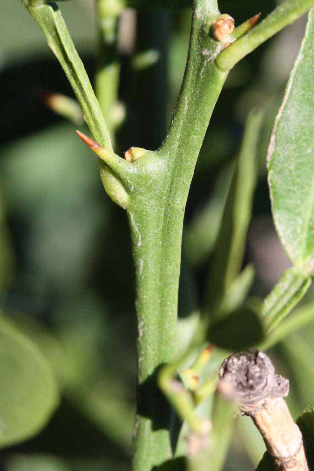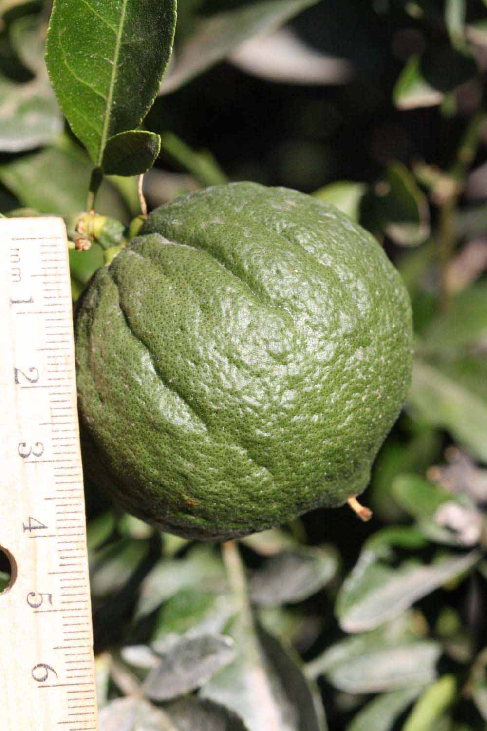 Crown compact or dense, not weeping. First-year twig surface glabrous; second- or third-year twig surface striate; thorns straight; prickles absent or not persistent. Petiole glabrous, length long, wings narrow, adjoining the blade. Leaflets one or three, margins crenate/crenulate or bluntly toothed, rachis wings absent, shade leaflet blades weakly conduplicate, sun leaflet blades weakly conduplicate. Leaflets not scented when crushed. Fruit broader than long; rind yellow-orange (11), orange (12), or red-orange (13); rind texture medium rough (6-7) or rough (8); firmness leathery; navel absent; flesh orange or yellow; taste sour.