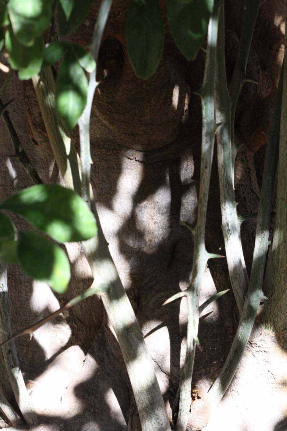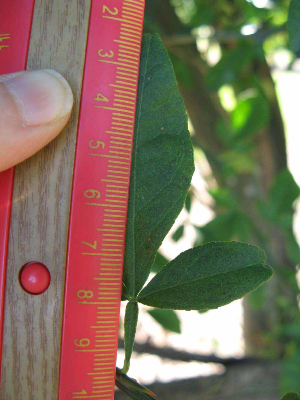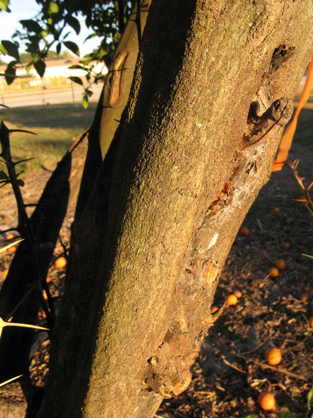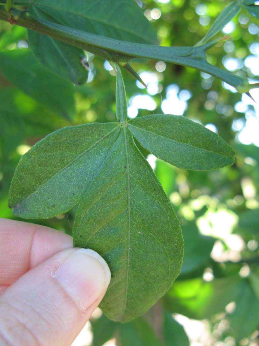 Crown compact or dense, not weeping. First-year twig surface glabrous; second- or third-year twig surface striate; thorns straight; prickles absent or not persistent. Petiole glabrous, length long, wings narrow, adjoining the blade. Leaflets one or three, margins crenate/crenulate or bluntly toothed, rachis wings absent, shade leaflet blades weakly conduplicate, sun leaflet blades weakly conduplicate. Leaflets not scented when crushed. Fruit broader than long; rind yellow-orange (11), orange (12), or red-orange (13); rind texture medium rough (6-7) or rough (8); firmness leathery; navel absent; flesh orange or yellow; taste sour.