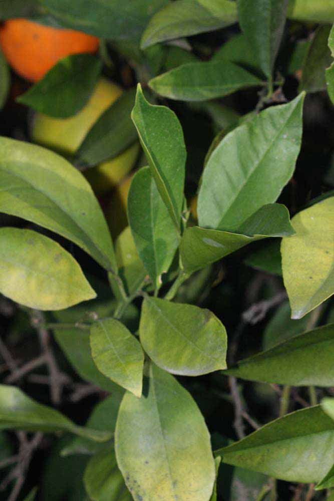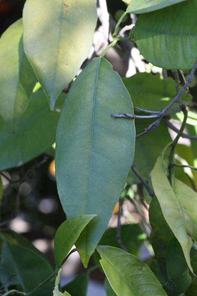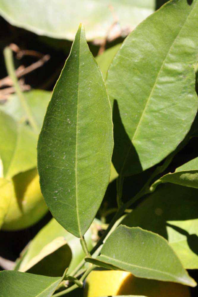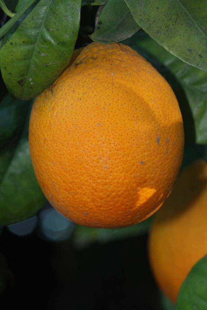 Crown compact or dense, not weeping. First-year twig surface glabrous; second- or third-year twig surface striate; thorns absent or not persistent; prickles absent or not persistent. Petiole glabrous, length medium, wings narrow, adjoining the blade. Leaflets one, margin bluntly toothed, shade leaflet blades flat or weakly conduplicate, sun leaflet blades weakly or strongly conduplicate. Leaflets sweetly orange-like when crushed. Fruit as broad as long or longer than broad; rind yellow (7-10), yellow-orange (11), orange (12), or red-orange (13); rind texture slightly rough (4-5); firmness leathery; navel absent; flesh orange; taste acidic-sweet.