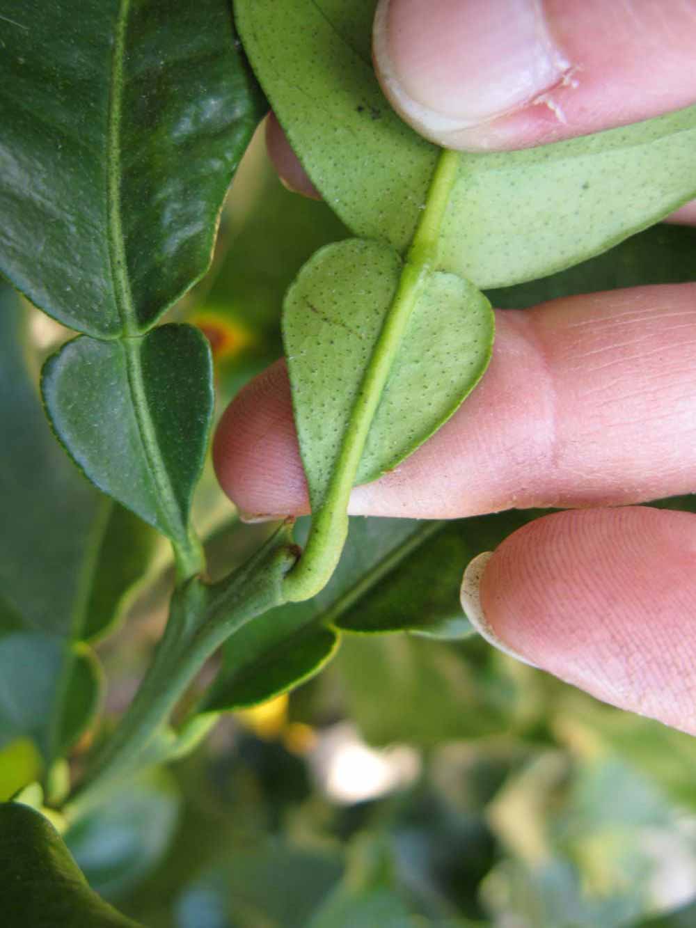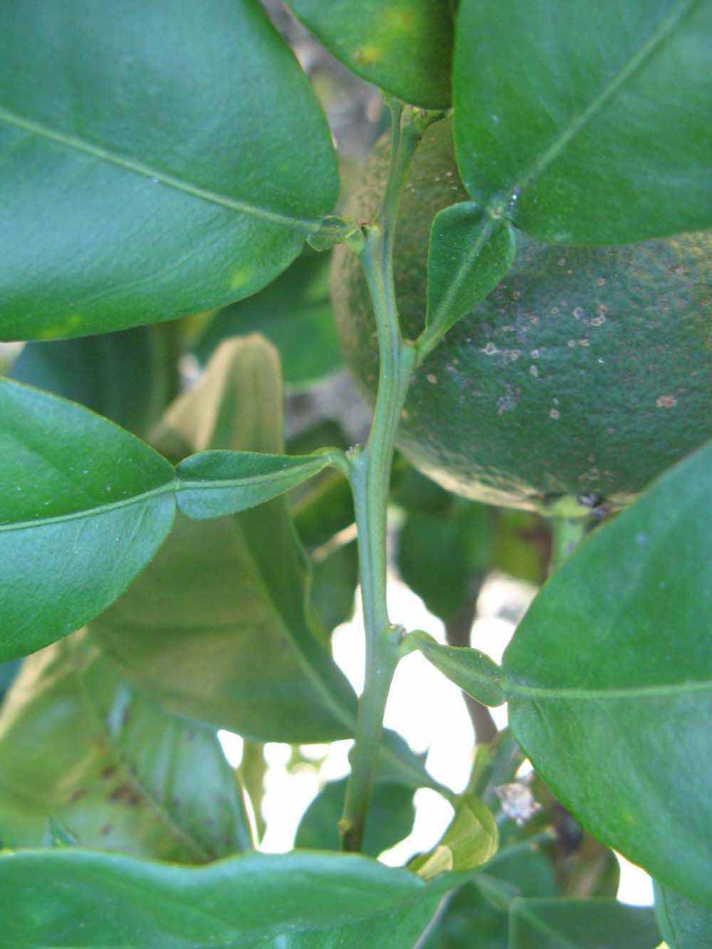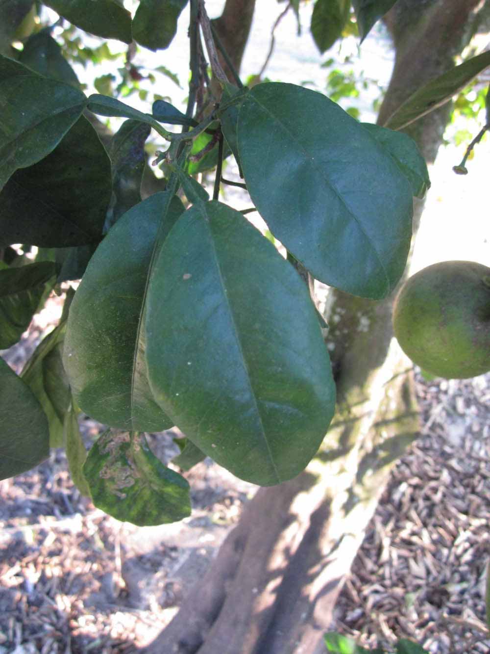 Crown compact or dense, not weeping. First-year twig surface glabrous; second- or third-year twig striate; thorns absent or not persistent; prickles absent or not persistent. Petiole glabrous, length medium, wings medium or wide, adjoining the blade or tucking beneath blade. Leaflets one. Margin crenate/crenulate or bluntly toothed, shade leaflet blades flat or weakly conduplicate. Sun leaflet blades weakly conduplicate or strongly conduplicate. Scent of crushed leaflets spicy or peppery. Fruit broader than long; rind green-yellow (6), yellow (7-10), yellow-orange (11), or orange (12); rind texture medium rough (6-7) or rough; firmness leathery; navel absent; flesh orange; taste sour.