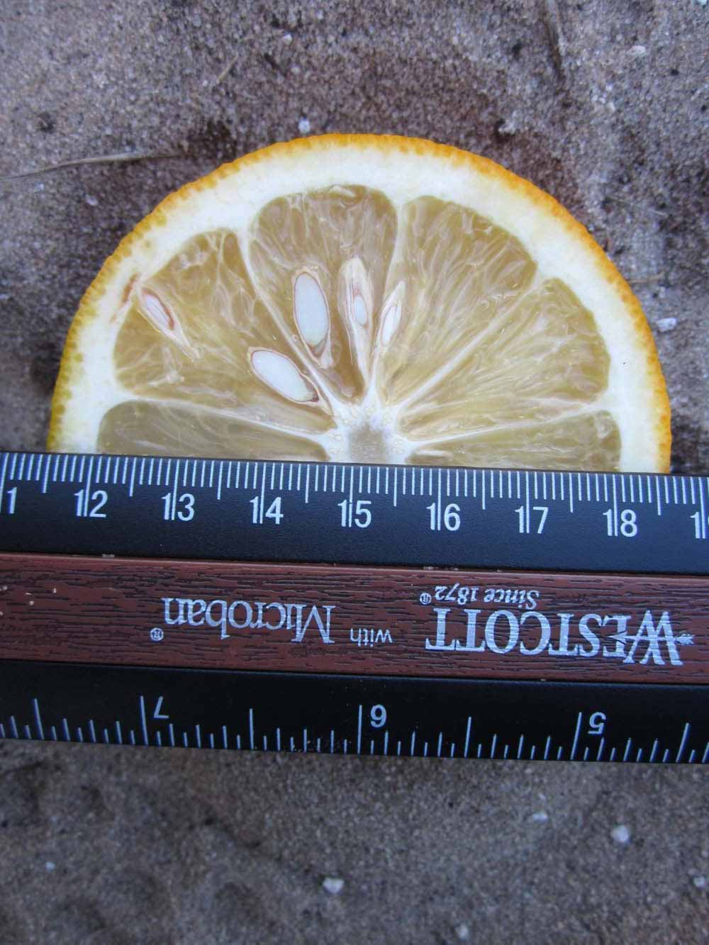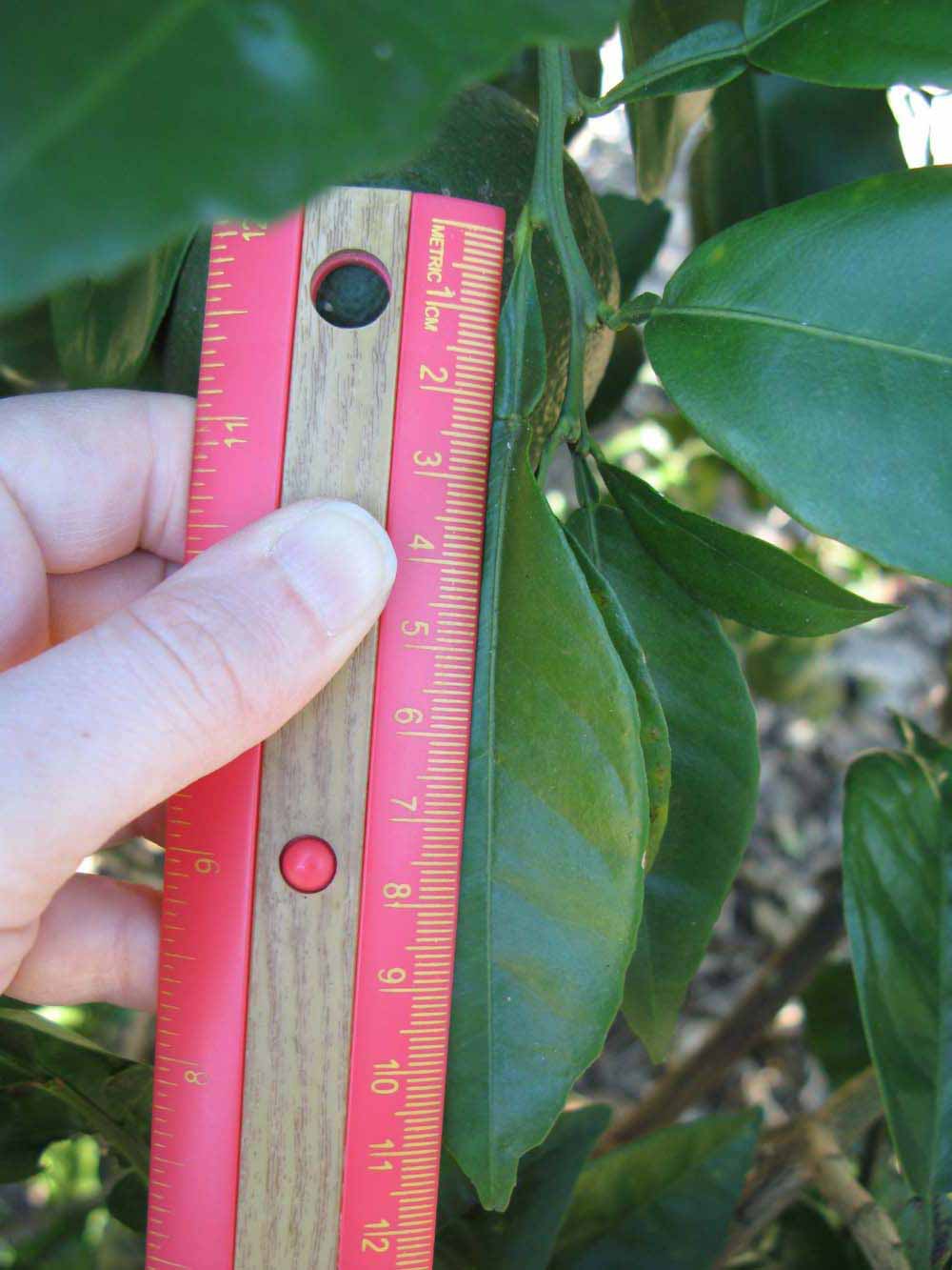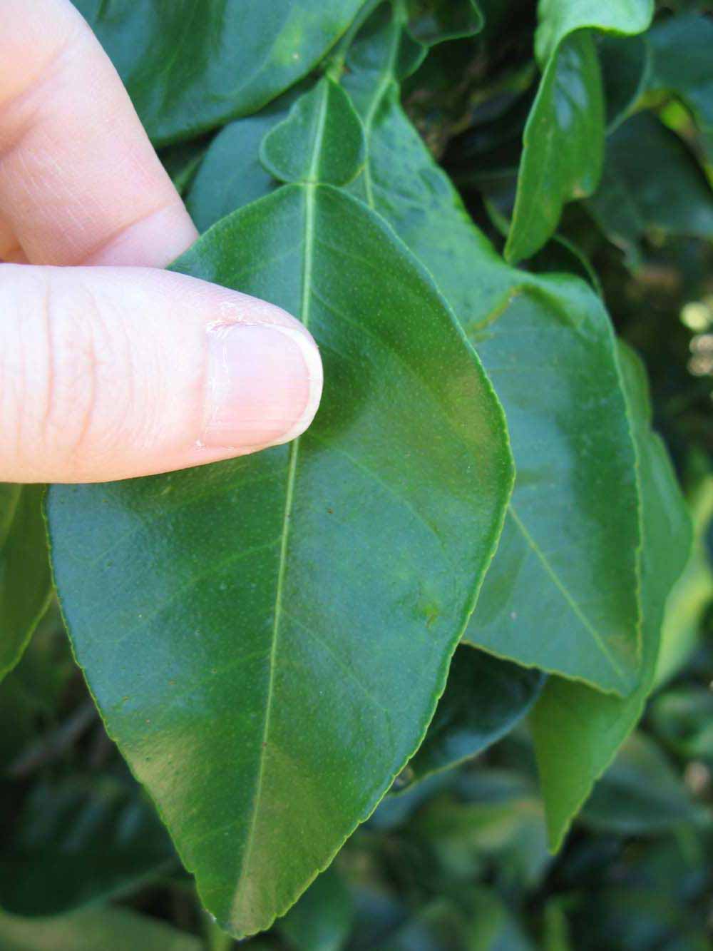 Crown compact or dense, not weeping. First-year twig surface glabrous; second- or third-year twig striate; thorns absent or not persistent; prickles absent or not persistent. Petiole glabrous, length medium, wings medium or wide, adjoining the blade or tucking beneath blade. Leaflets one. Margin crenate/crenulate or bluntly toothed, shade leaflet blades flat or weakly conduplicate. Sun leaflet blades weakly conduplicate or strongly conduplicate. Scent of crushed leaflets spicy or peppery. Fruit broader than long; rind green-yellow (6), yellow (7-10), yellow-orange (11), or orange (12); rind texture medium rough (6-7) or rough; firmness leathery; navel absent; flesh orange; taste sour.