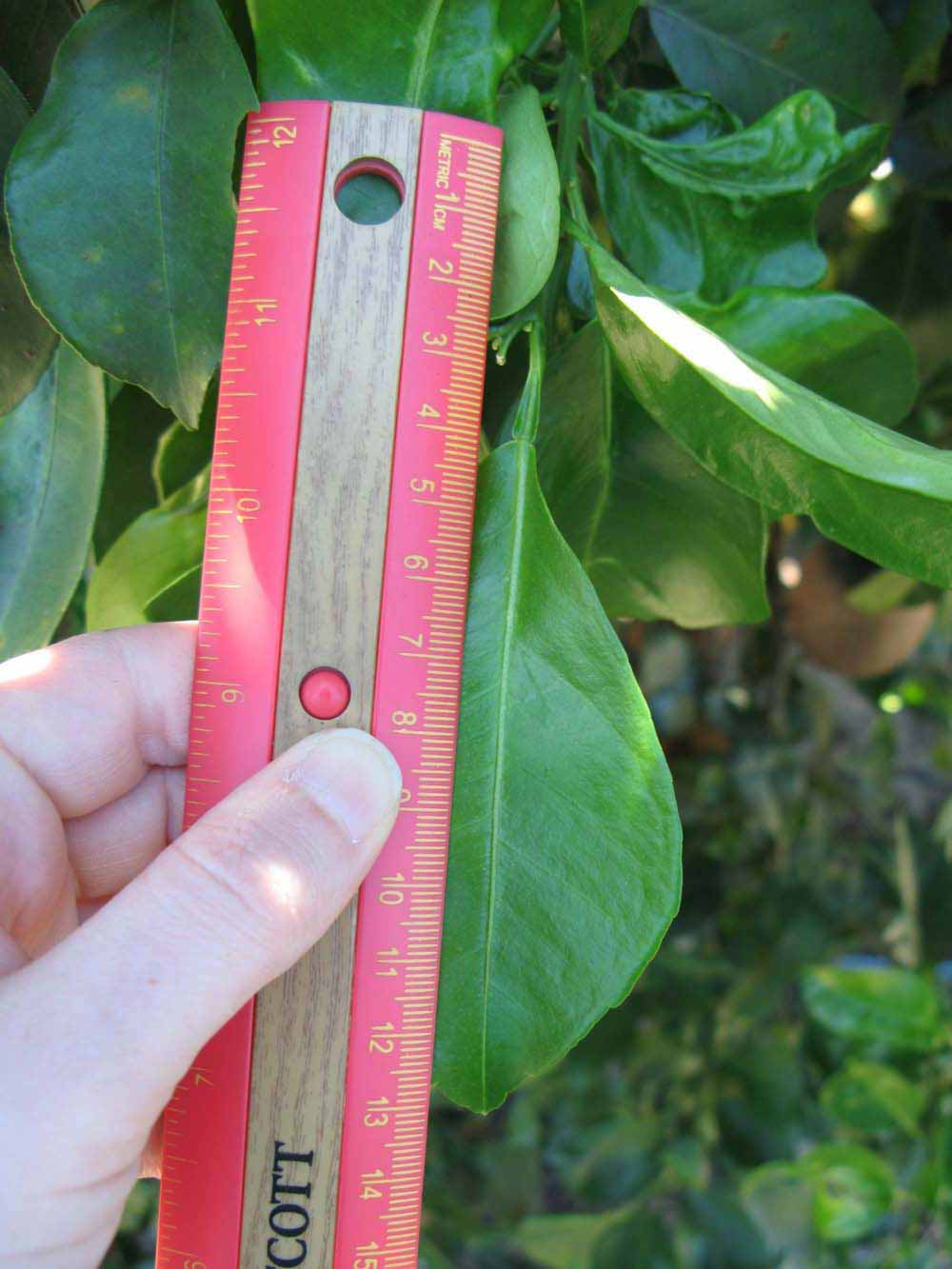 Crown compact or dense, not weeping. First-year twig surface glabrous; second- or third-year surface striate; thorns absent or not persistent; prickles absent or not persistent. Petiole glabrous, length medium, wings medium or wide, adjoining the blade. Leaflets one, margin bluntly toothed, shade leaflet blades flat or weakly conduplicate, sun leaflet blades weakly or strongly conduplicate. Scent of crushed leaflets spicy or peppery. Fruit broader than long, or as broad as long, or longer than broad; rind yellow (7-10), yellow-orange (11), orange (12), or red-orange (13); rind texture medium rough (6-7); firmness leathery; navel absent; flesh orange; taste acidic-sweet.