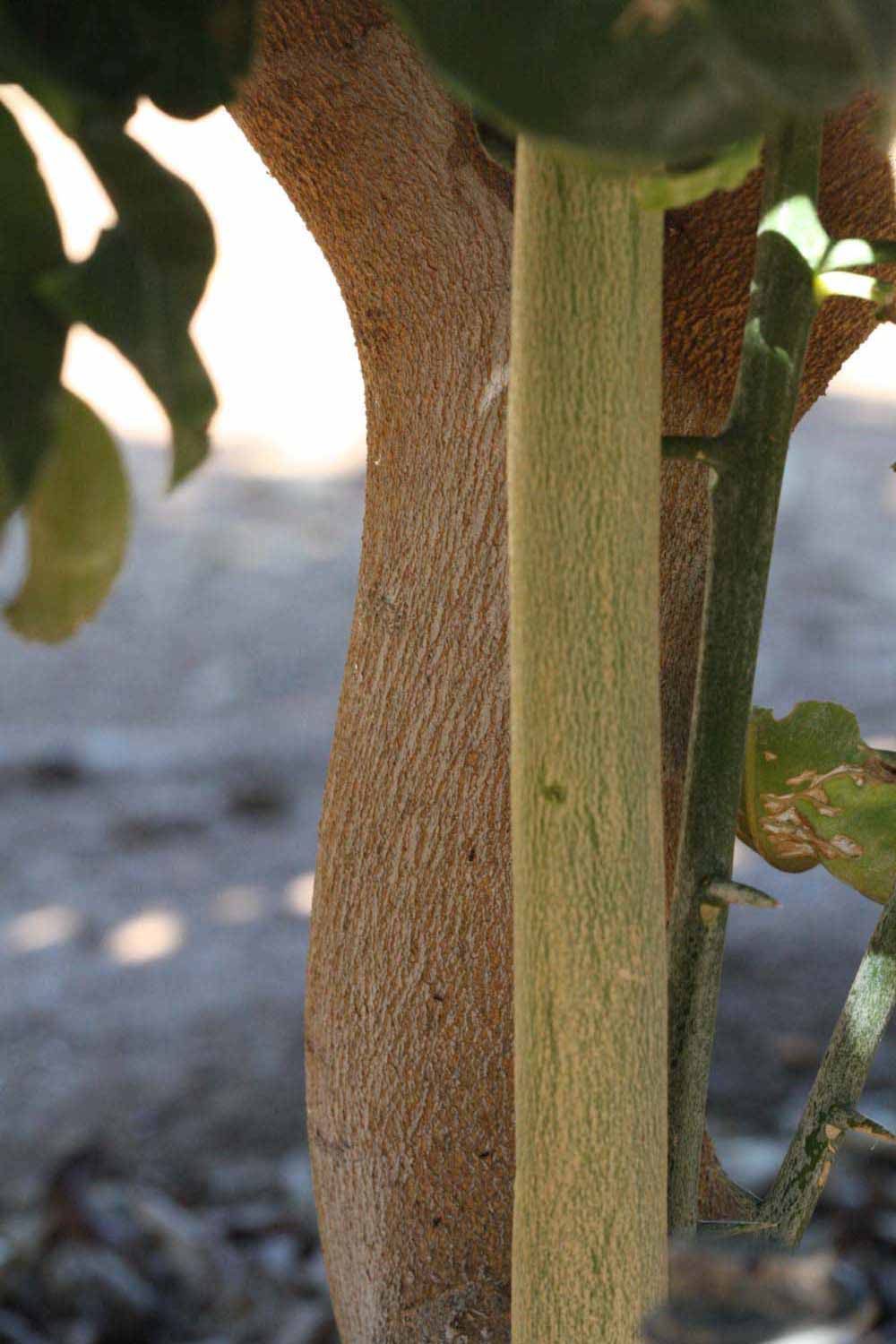 Crown compact or dense, not weeping. First-year twig surface glabrous; second- or third-year twig striate; thorns absent or not persistent; prickles absent or not persistent. Petiole glabrous, length short or medium, wings absent, if present, narrow, adjoining the blade. Leaflets one, margin crenate/crenulate or bluntly toothed, shade leaflet blades weakly conduplicate, sun leaflet blades weakly or strongly conduplicate. Scent of crushed leaflets spicy or peppery. Fruit as broad as long or longer than broad; rind yellow (7-10), yellow-orange (11), orange (12), or red-orange (13); rind texture smooth (1-3) or slightly rough (4-5); firmness leathery; navel absent; flesh orange; taste sour.
