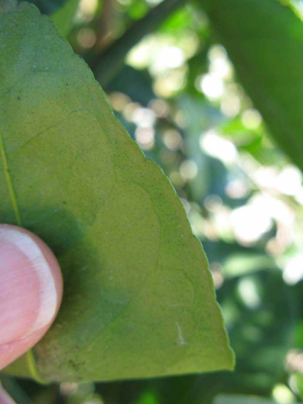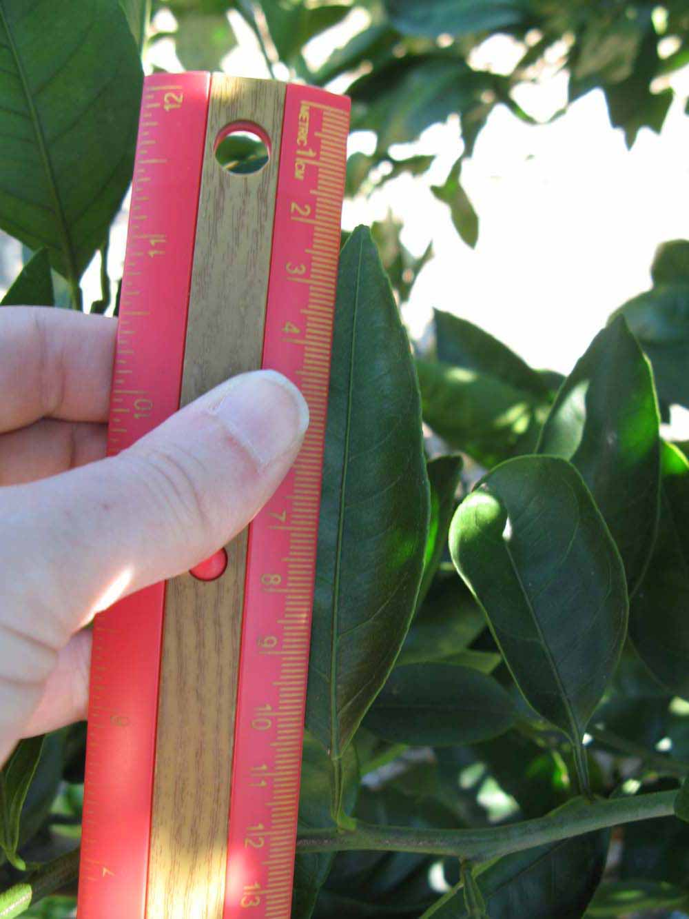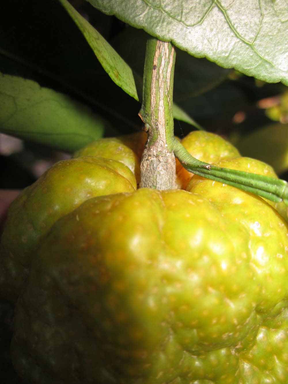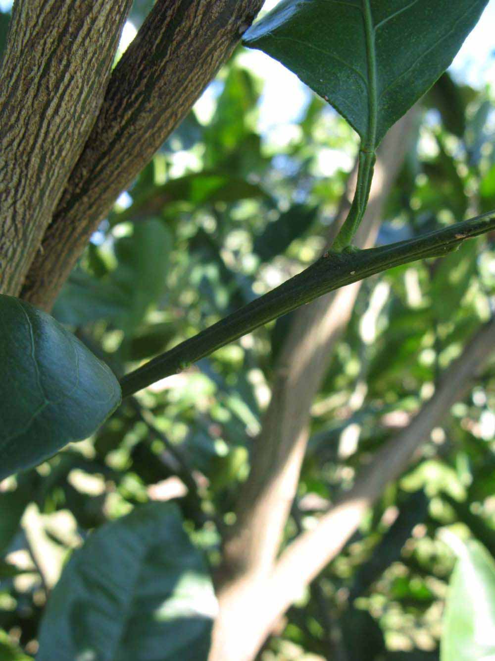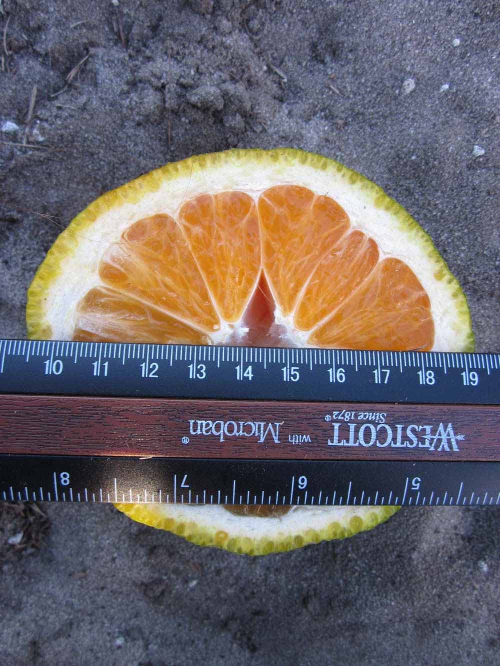 Crown compact or dense, not weeping. First-year twig surface glabrous; second- or third-year twig striate; thorns absent or not persistent; prickles absent or not persistent. Petiole glabrous, length medium, wings narrow, adjoining the blade. Leaflets one, margin bluntly toothed, shade leaflet blades weakly conduplicate, sun leaflet blades weakly conduplicate. Scent of crushed leaflets mandarin-like. Fruit as broad as long or longer than broad; rind green-yellow (6), yellow (7-10), yellow-orange (11), or orange (12); rind texture slightly rough (4-5), medium rough (6-7), or rough (8); firmness leathery; navel absent; flesh orange; taste acidic-sweet.