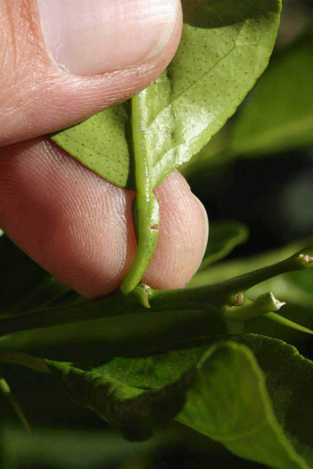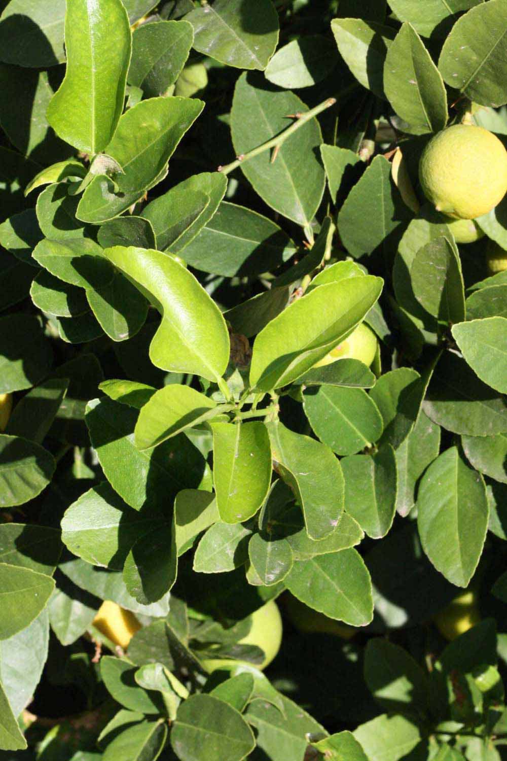 Crown compact or dense, not weeping. First- year twig surface glabrous; second- or third-year twig surface striate; thorns straight; prickles absent or not persistent. Petiole glabrous, length medium, wings narrow, adjoining the blade. Leaflets one, margin crenate/crenulate, shade leaflet blades weakly conduplicate, sun leaflet blades weakly conduplicate. Scent of crushed leaflets freshly lemon-like. Fruit broader than long, rind green-yellow (6), yellow (7-10), or yellow-orange (11); rind texture slightly rough (4-5); firmness leathery; navel absent; flesh green/greenish or yellow; taste sour.