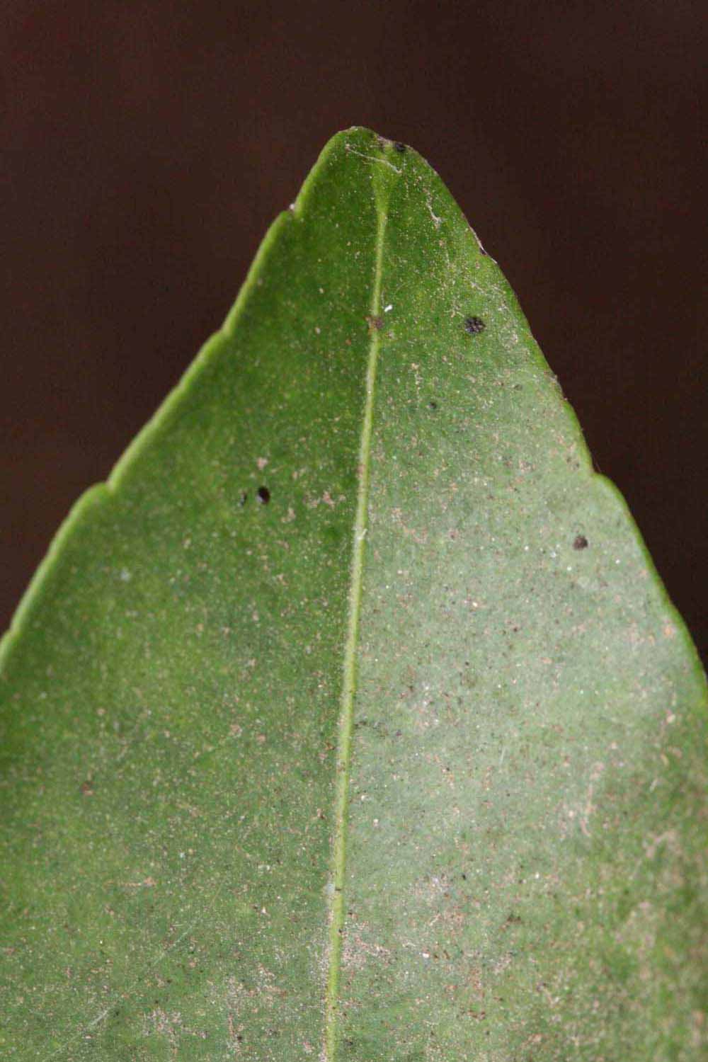 A description of the paratype in the herbarium of Hokkaido Imperial University made by Tanaka reads as follows: "Branches small and slender; thorns about 3 mm long, acute. Leaves long, ovate-elliptical, subcoriaceous, broadly acuminate, obtuse and incised at the tip, somewhat broad and convex at the base, indistinctly dentate at the margin, midrib slender, straight and distinct beneath, veins almost indistinct, oil glands indistinct; petiole short, small, with linear wings which seem to be on the verge of degeneration. Flowers axillary, solitary, small. Pedicels 2 mm long, slender, glabrous; scales at the base triangular, ciliate at the margin. Calyx 3 mm in diameter; sepals somewhat recurved outward, densely ciliate at the margin. Disk large, ring-form, subcarnose, depressed at the apex. Ovary almost globular, attenuate at the base, about 2 X 2 mm in size.""