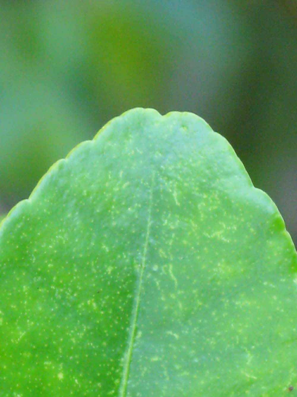 Thanks to flowering material from Mauritius and from Montpellier preserved in the Kew Herbarium, it is possible to determine with certainty that C. hystrix is the species with very bumpy fruits belonging to the subgenus Papeda that is widely distributed in Indonesia. The fruits usually have 10 to 12 segments (rarely 13 or 14). The leaves are blunt-pointed, usually of medium size, 8 to 12 by 3 to 5 cm, more or less irregular at the tip and sometimes slightly emarginate. The margins are more or less crenate. The winged petiole, usually two-thirds to three-fourths as long as the leaf blade, is broadly rounded and blunt at the base, often subtruncate at the tip, often with more or less crenate margins.