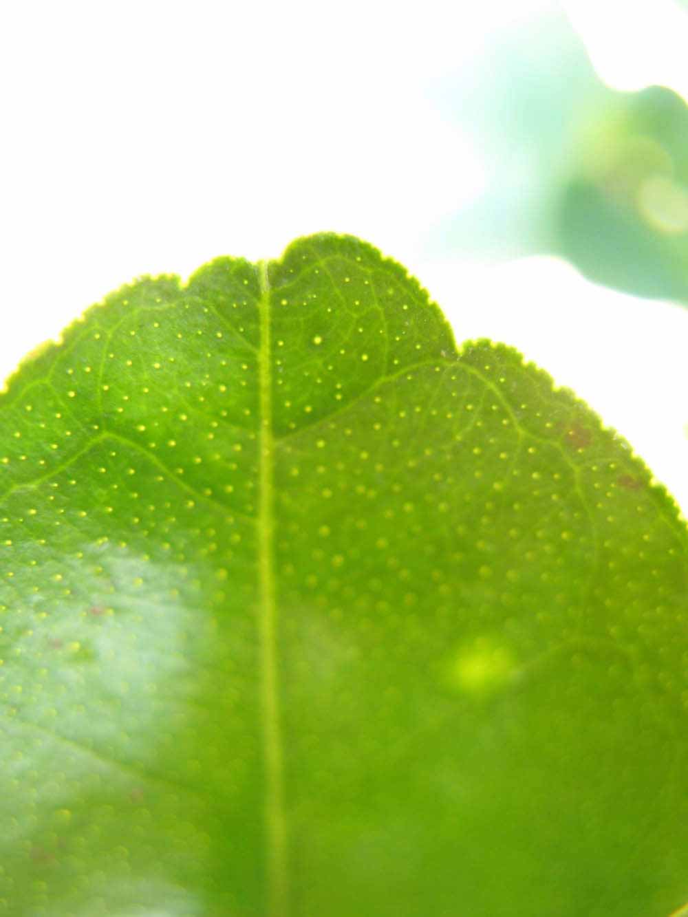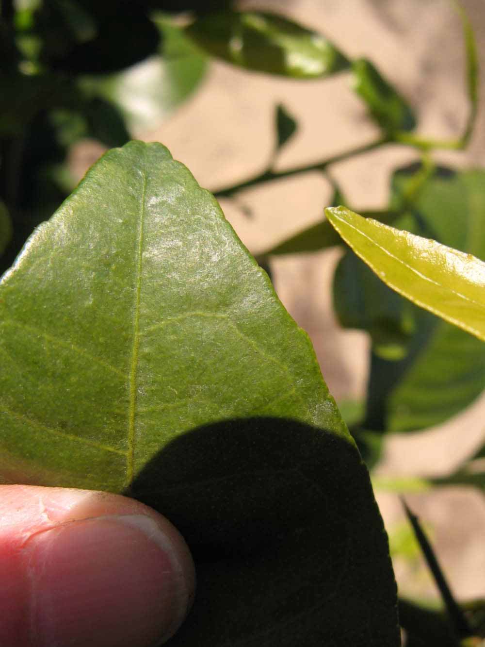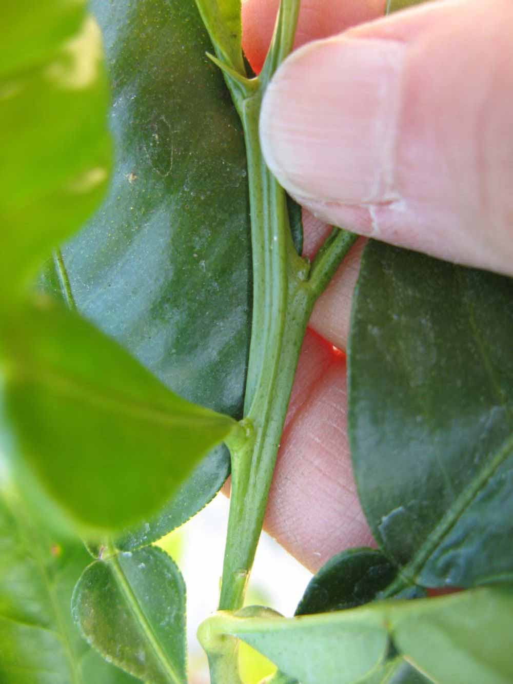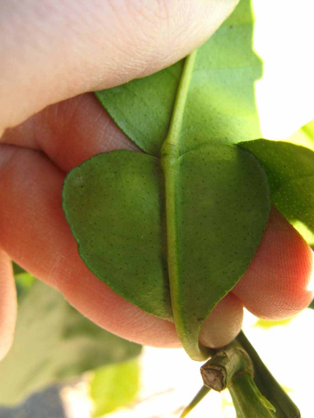 Crown compact or dense, not weeping. First-year twig surface glabrous; second- or third-year twig surface striate; thorns straight; prickles absent or not persistent. Petiole glabrous, length medium; wings medium or wide, adjoining the blade or tucking beneath blade. Leaflets one, margin bluntly toothed, shade leaflet blades weakly conduplicate, sun leaflet blades weakly conduplicate. Scent of crushed leaflets spicy or peppery. Fruit broader than long, as broad as long, or longer than broad; rind light green with some break to yellow (5), green-yellow (6), yellow (7-10), yellow-orange (11), orange (12), or red-orange (13); rind texture smooth (1-3), slightly rough (4-5) or medium rough (6-7); firmness leathery; navel absent; flesh orange or yellow; taste acidic-sweet or sour.