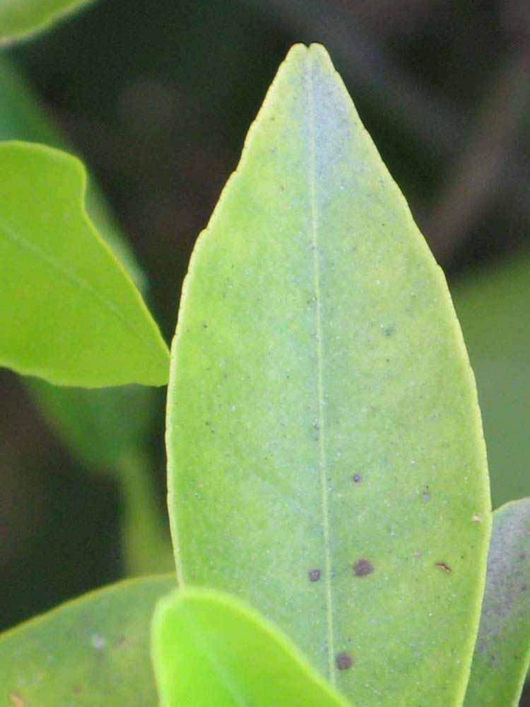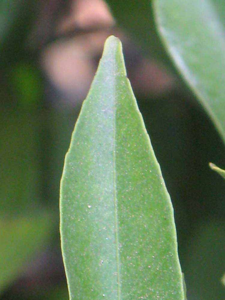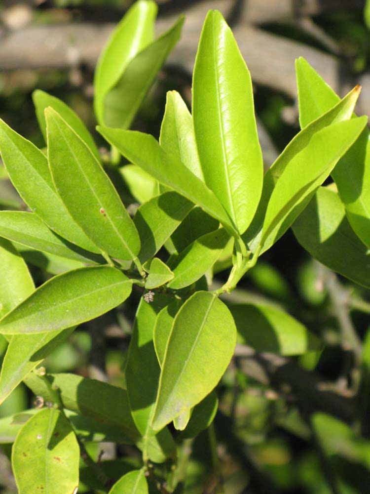 Crown compact or dense, not weeping. First-year twig surface glabrous; second- or third-year twig surface striate; thorns absent or not persistent; prickles absent or not persistent. Petiole glabrous, length short; wings narrow, adjoining the blade. Leaflets one, margin entire or bluntly toothed, shade leaflet blades weakly conduplicate, sun leaflet blades weakly conduplicate. Scent of crushed leaflets mandarin-like. Fruit as broad as long or longer than broad; rind yellow (7-10), yellow-orange (11), orange (12), or red-orange (13); rind texture slightly rough (4-5); firmness leathery; navel absent; flesh orange; taste acidic-sweet.