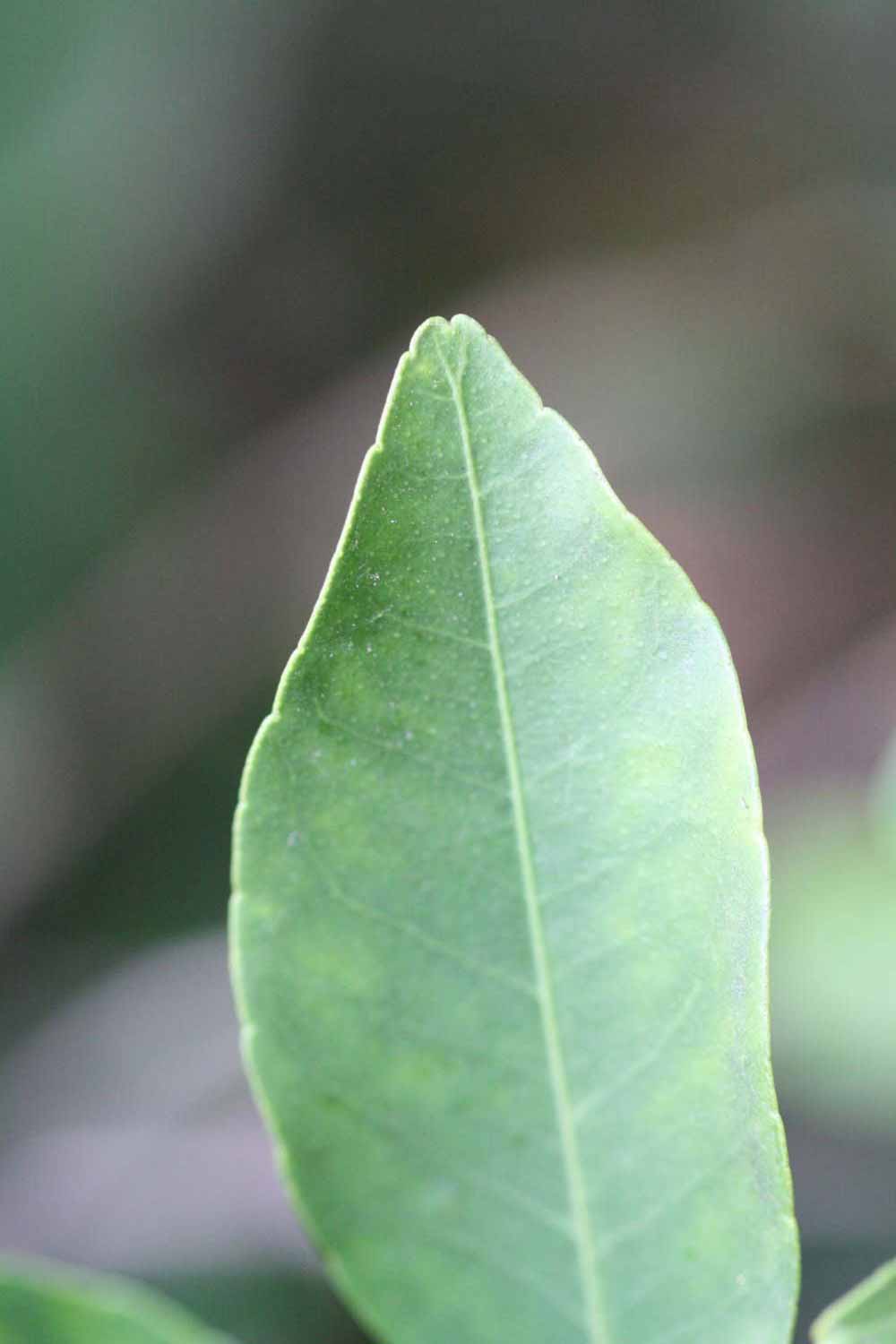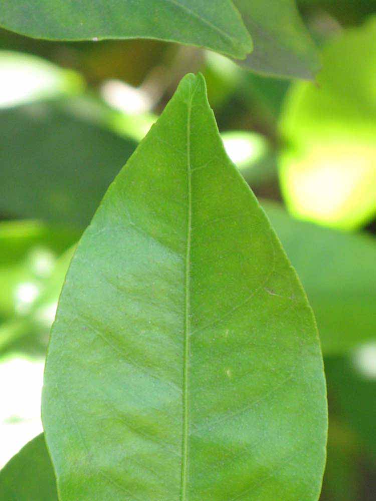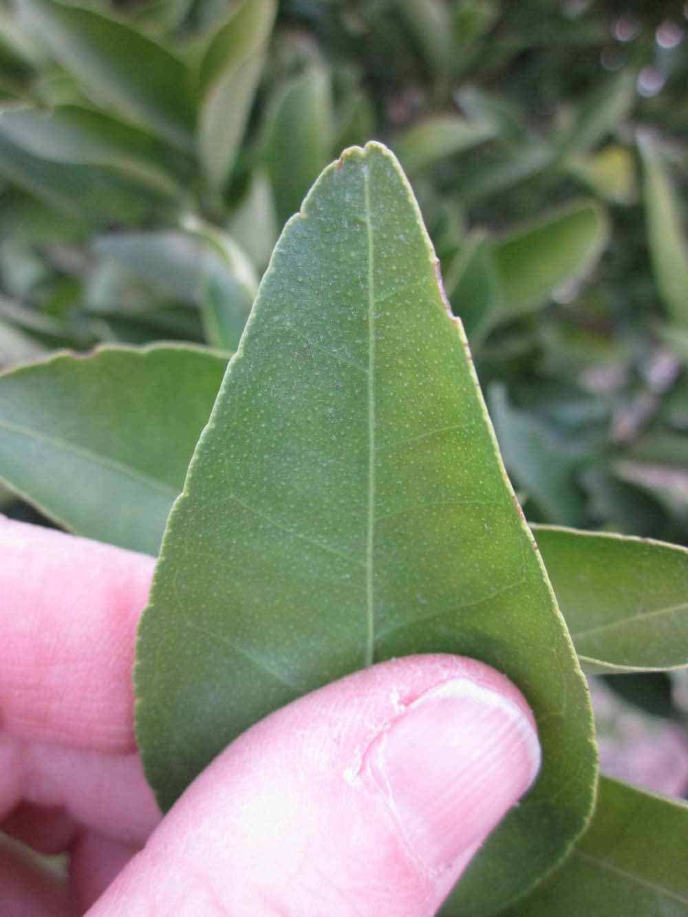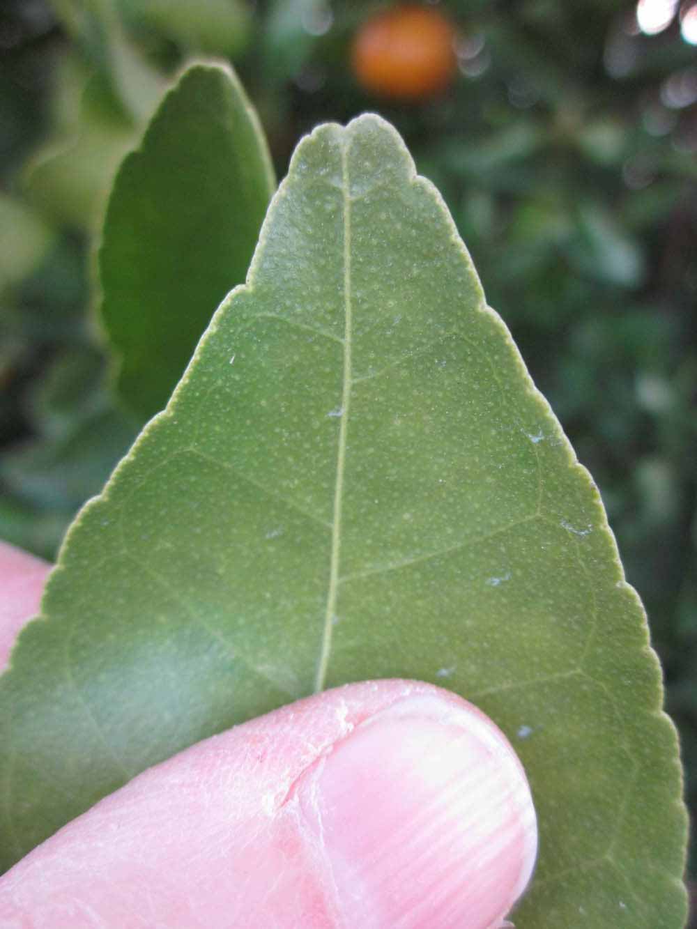 Crown compact or dense, not weeping. First-year twig surface glabrous; second- or third-year twig surface striate; thorns absent or not persistent; prickles absent or not persistent. Petiole glabrous, length medium; wings absent, if present, narrow, adjoining the blade. Leaflets one, margin entire or bluntly toothed, shade leaflet blades weakly conduplicate, sun leaflet blades weakly or strongly conduplicate. Scent of crushed leaflets mandarin-like. Fruit broader than long; rind yellow (7-10), yellow-orange (11), orange (12), or red-orange (13); rind texture slightly rough (4-5) or medium rough (6-7); firmness leathery; navel absent; flesh orange; taste acidic-sweet.
