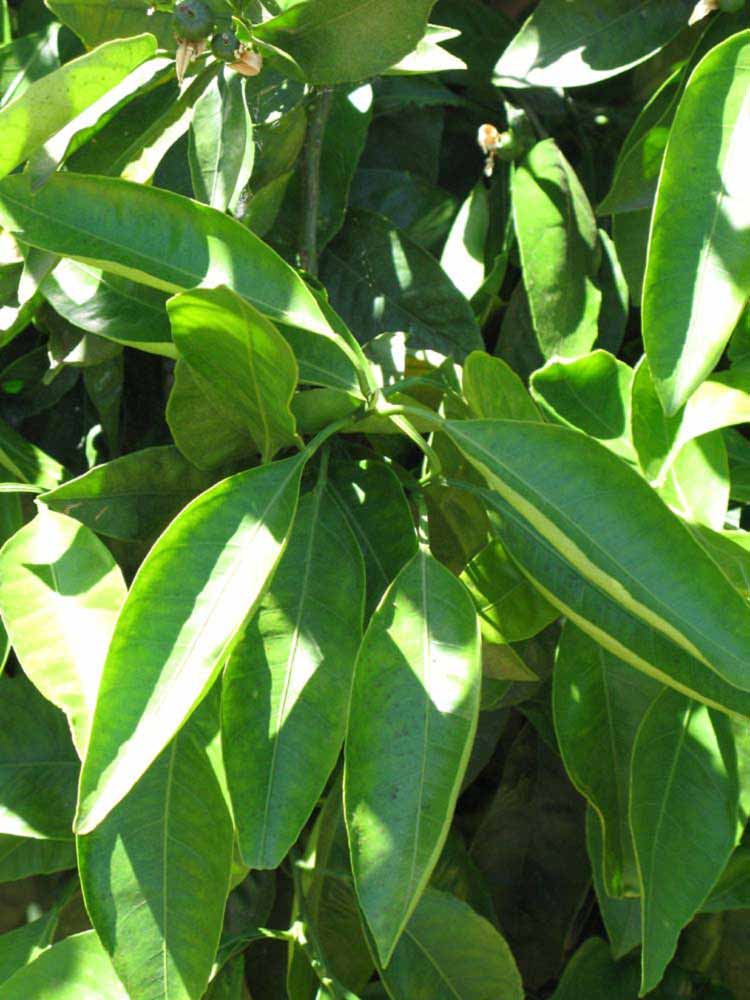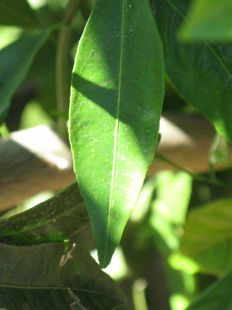 Crown compact or dense, not weeping. First-year twig surface glabrous; second- or third-year twig surface striate; thorns absent or not persistent; prickles absent or not persistent. Petiole glabrous, length medium; wings narrow, adjoining the blade. Leaflets one, margin entire or bluntly toothed, shade leaflet blades weakly conduplicate, sun leaflet blades weakly or strongly conduplicate. Scent of crushed leaflets mandarin-like. Fruit broader than long; rind yellow (7-10), yellow-orange (11), or orange (12); rind texture slightly rough (4-5); firmness leathery; navel absent; flesh orange; taste acidic-sweet.