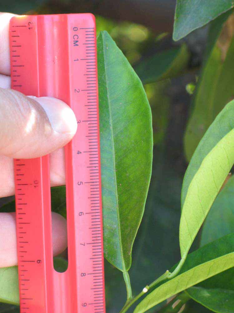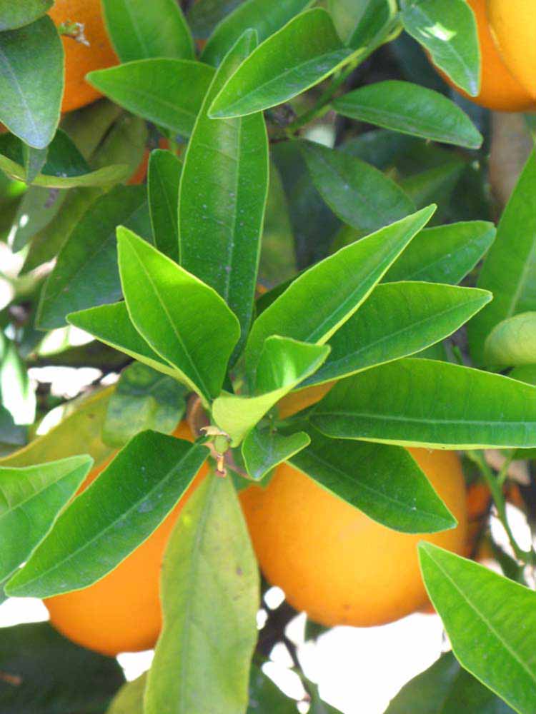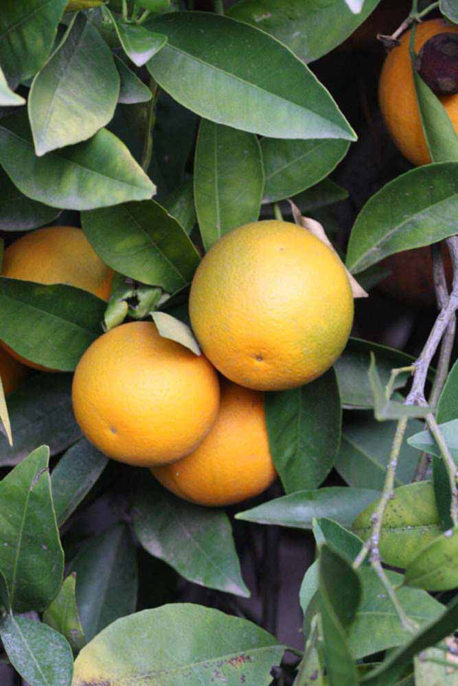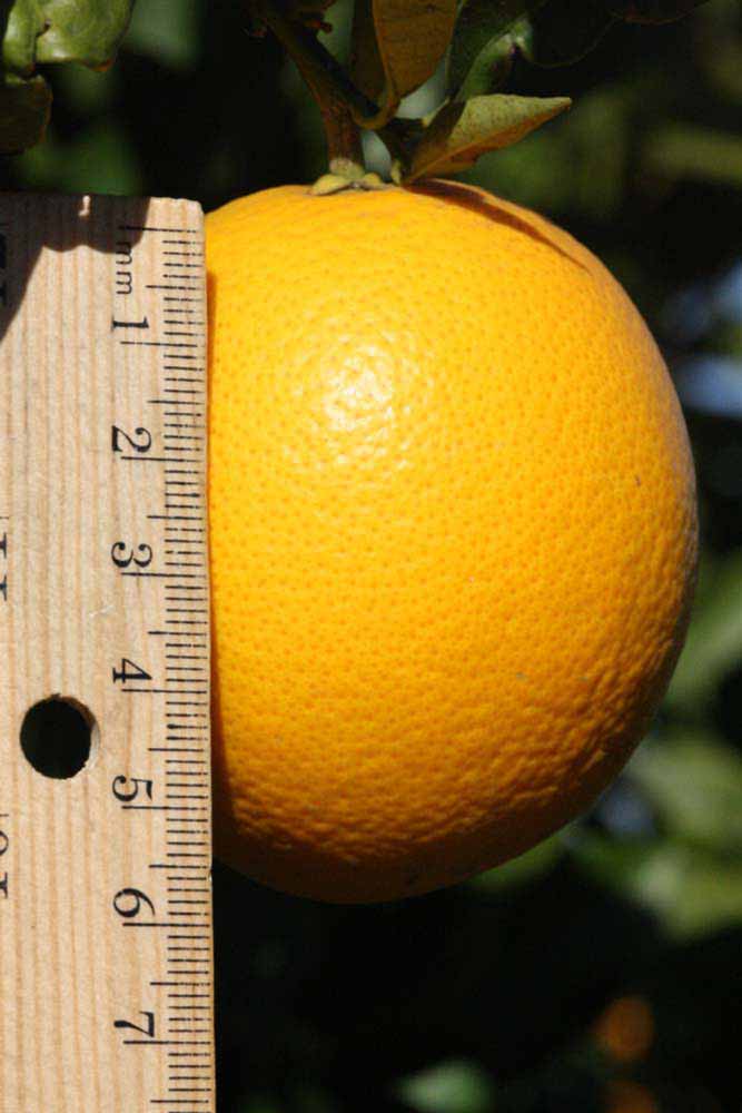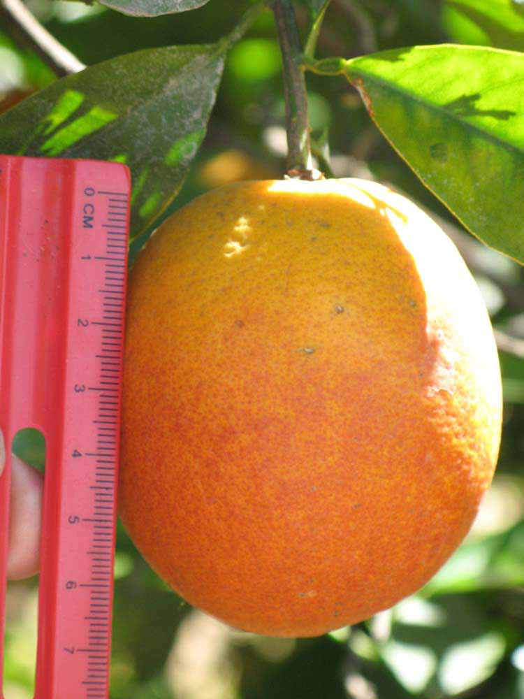 Crown compact or dense, not weeping. First-year twig surface glabrous; second- or third-year twig surface striate; thorns absent or not persistent; prickles absent or not persistent. Petiole glabrous, length medium; wings narrow, adjoining the blade. Leaflets one, margin entire (by misinterpretation) or bluntly toothed, shade leaflet blades flat or weakly conduplicate, sun leaflet blades weakly conduplicate. Scent of crushed leaflets orange-like. Fruit as broad as long or longer than broad; rind yellow-orange (11), orange (12), or red-orange (13); rind texture slightly rough (4-5); firmness leathery; navel absent; flesh orange or red/purplish-tinged; taste acidic-sweet.