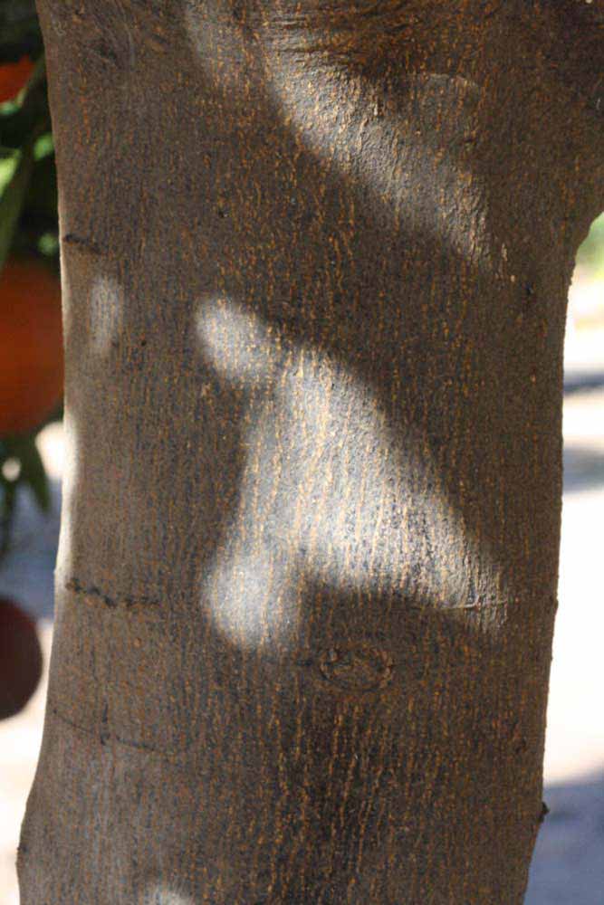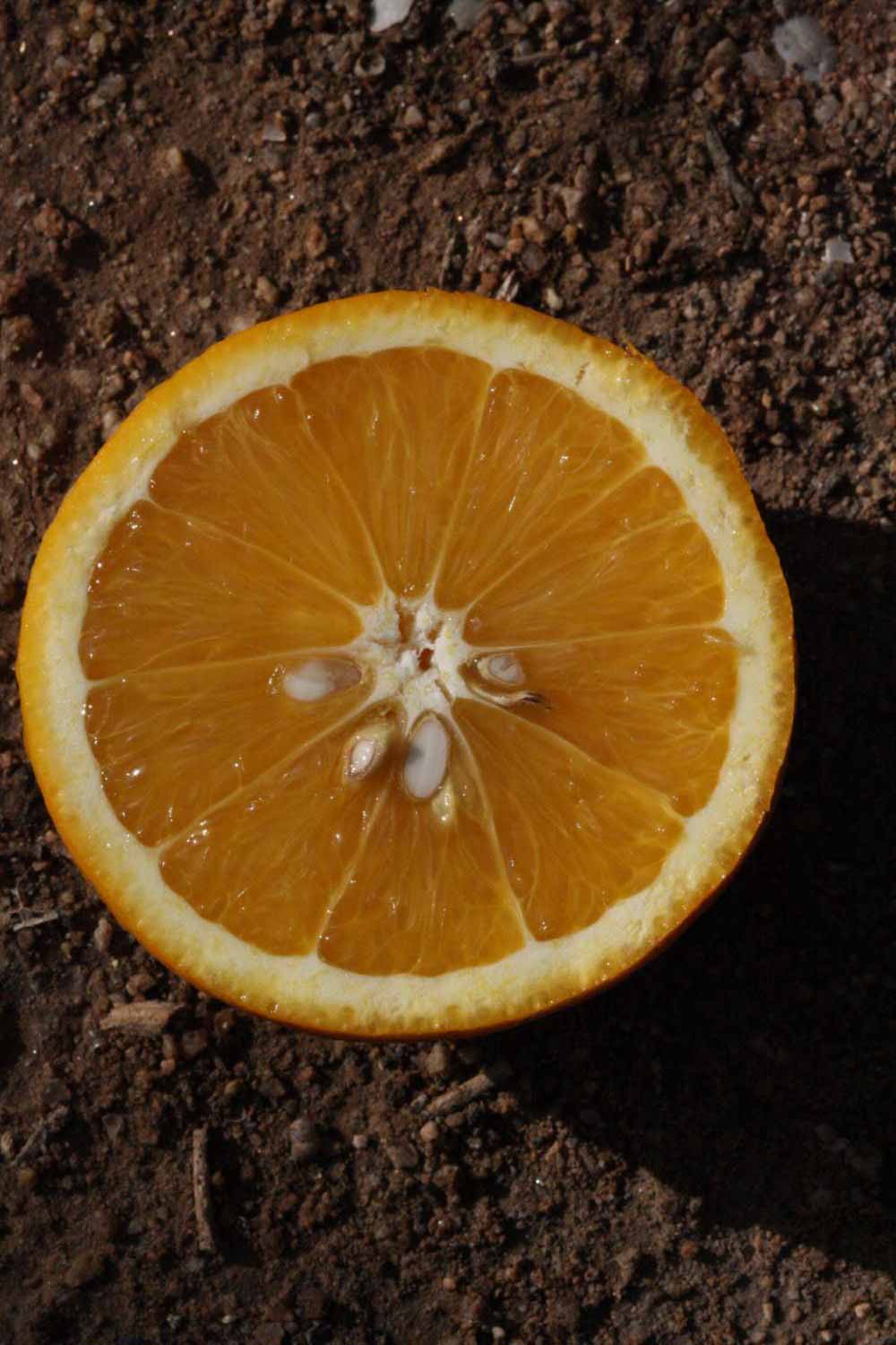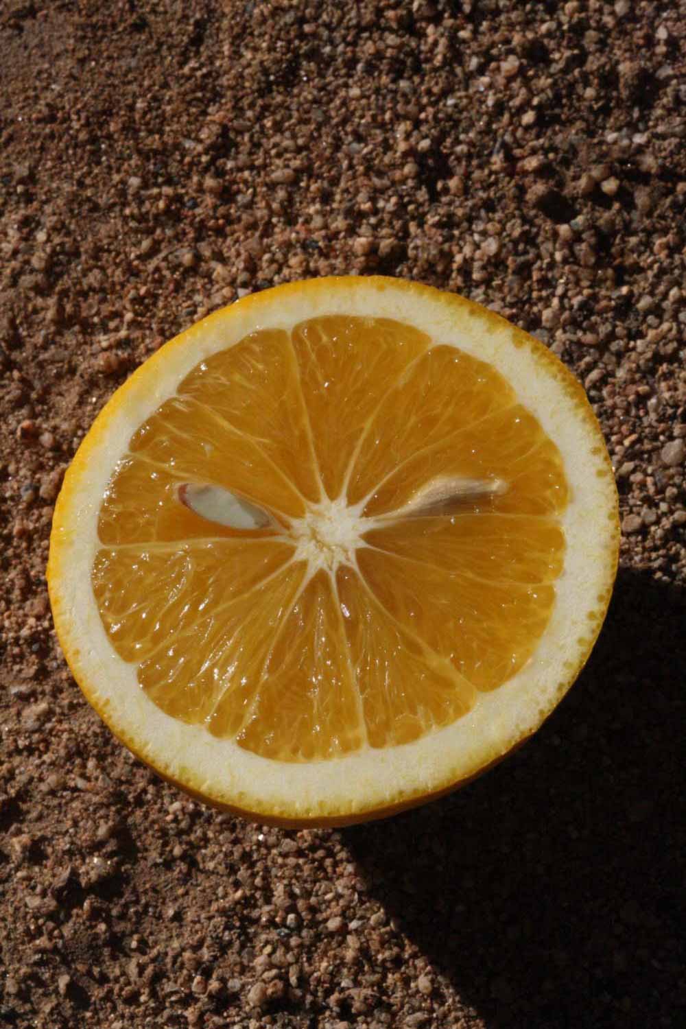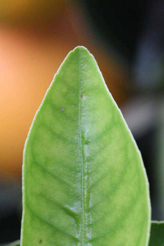 Crown compact or dense, not weeping. First-year twig surface glabrous; second- or third-year twig surface striate; thorns absent or not persistent; prickles absent or not persistent. Petiole glabrous, length medium; wings narrow, adjoining the blade. Leaflets one, margin entire (by misinterpretation) or bluntly toothed, shade leaflet blades flat or weakly conduplicate, sun leaflet blades weakly conduplicate. Scent of crushed leaflets orange-like. Fruit as broad as long or longer than broad; rind yellow-orange (11), orange (12), or red-orange (13); rind texture slightly rough (4-5); firmness leathery; navel absent; flesh orange or red/purplish-tinged; taste acidic-sweet.