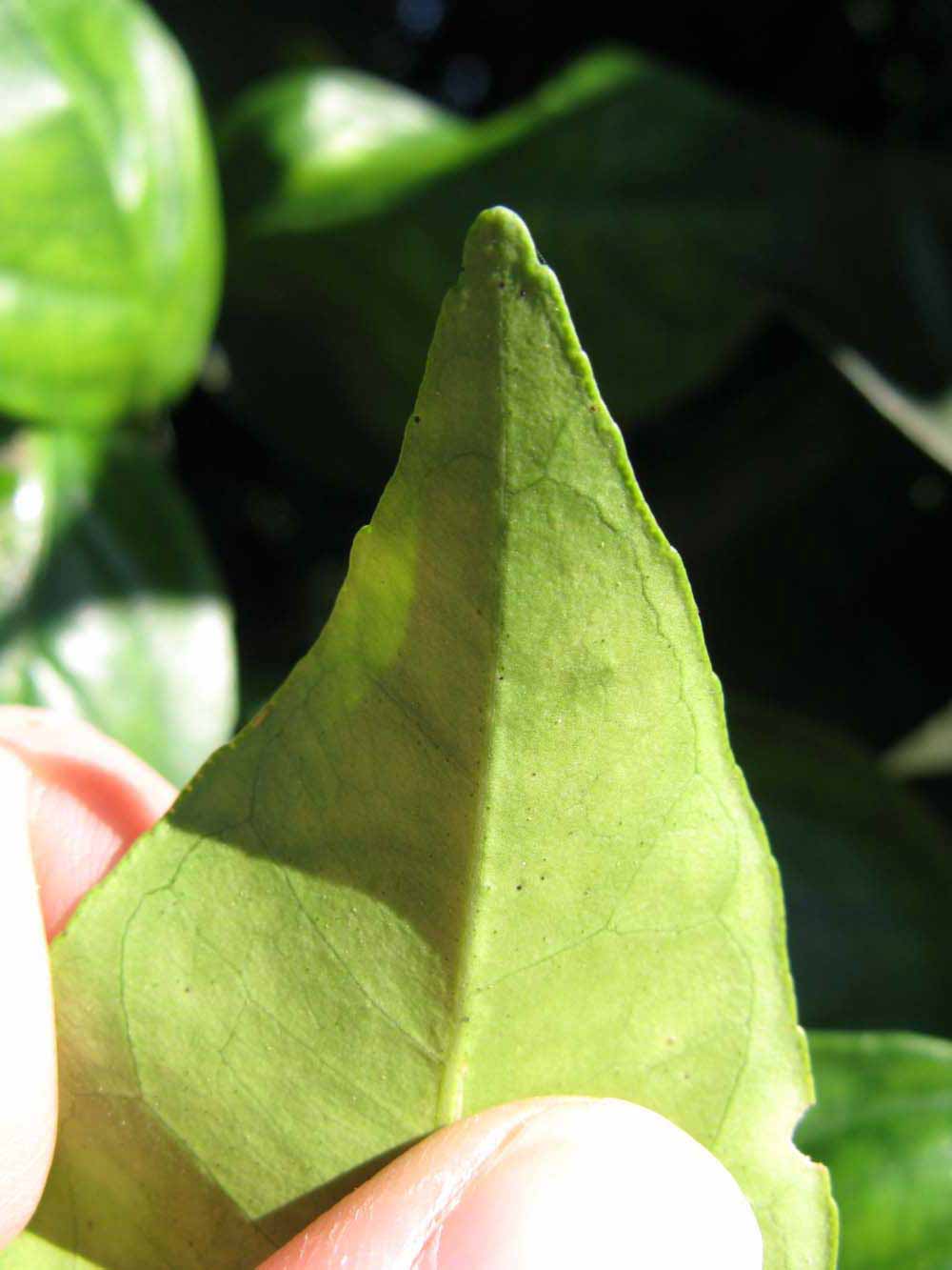 Crown compact or dense, not weeping. First-year twig surface glabrous; second- or third-year twig surface striate; thorns absent or not persistent; prickles absent or not persistent. Petiole glabrous, length short; wings absent, if present, medium, adjoining the blade or tucking beneath blade. Leaflets one, margin entire or bluntly toothed, shade leaflet blades flat or weakly conduplicate, sun leaflet blades weakly or strongly conduplicate. Scent of crushed leaflets sweetly orange-like. Fruit as broad as long or longer than broad; rind yellow (7-10), yellow-orange (11), orange (12), or red-orange (13); rind texture slightly rough (4-5) or medium rough (6-7); firmness leathery, navel absent; flesh orange; taste acidic-sweet.
