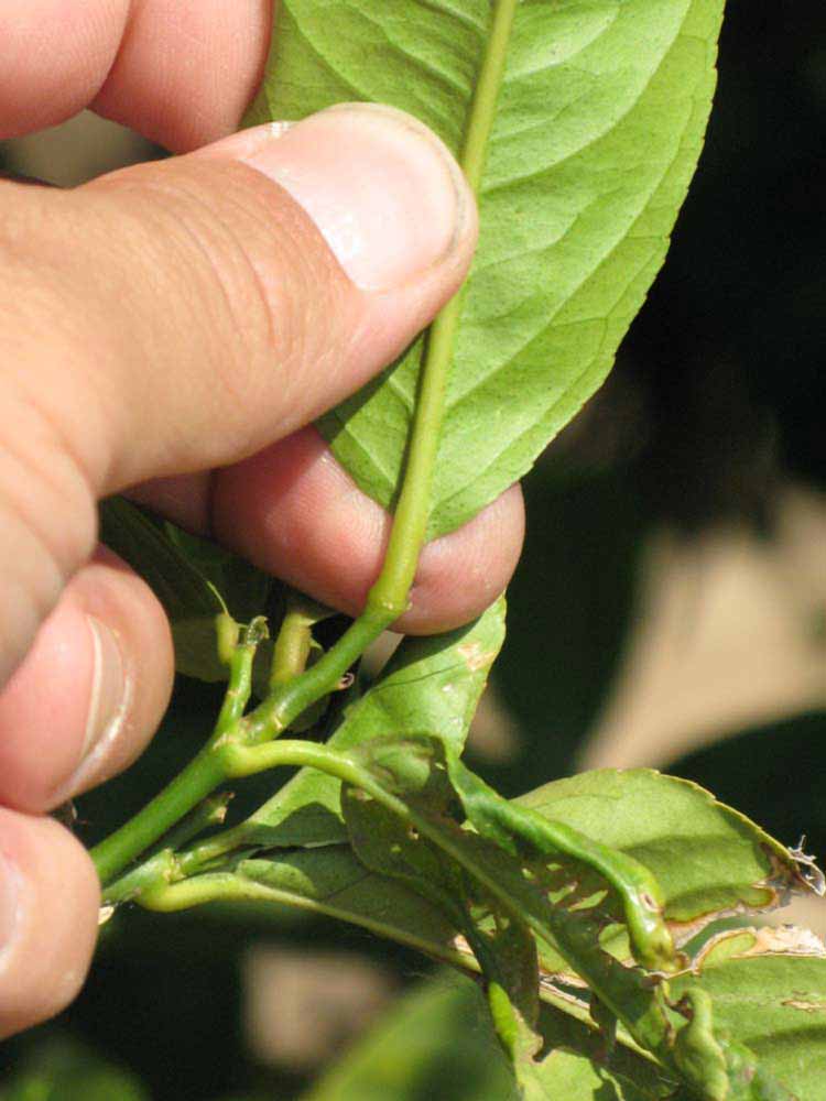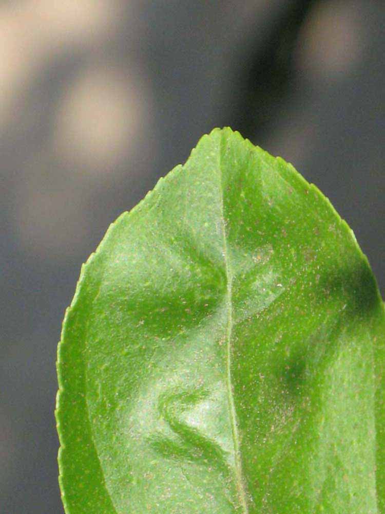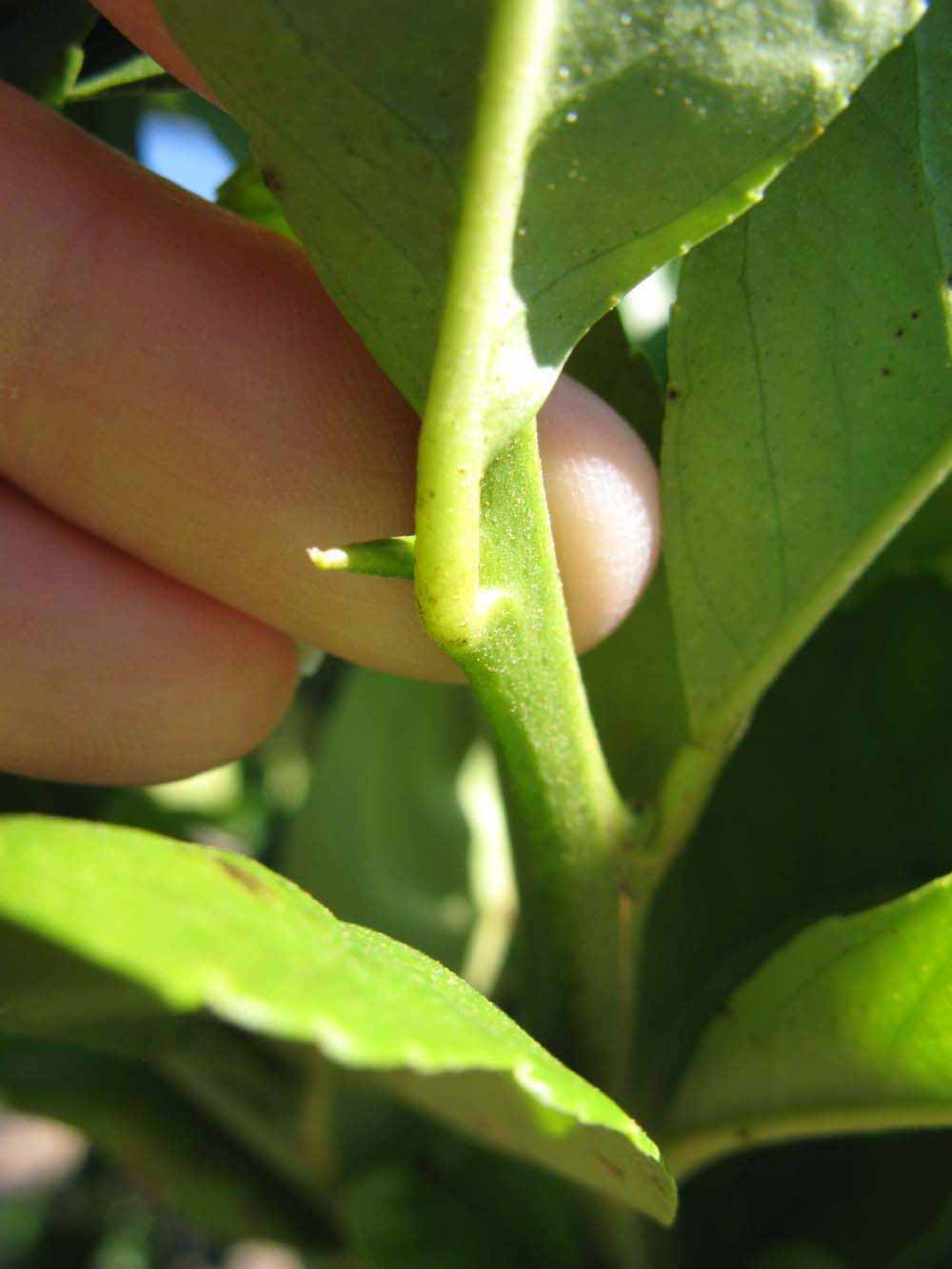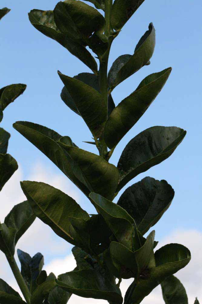 Tree smaller and less vigorous and productive than most citrons; leaves more round-pointed and downward cupped. Flower buds, flowers, and new growth purple-tinted."