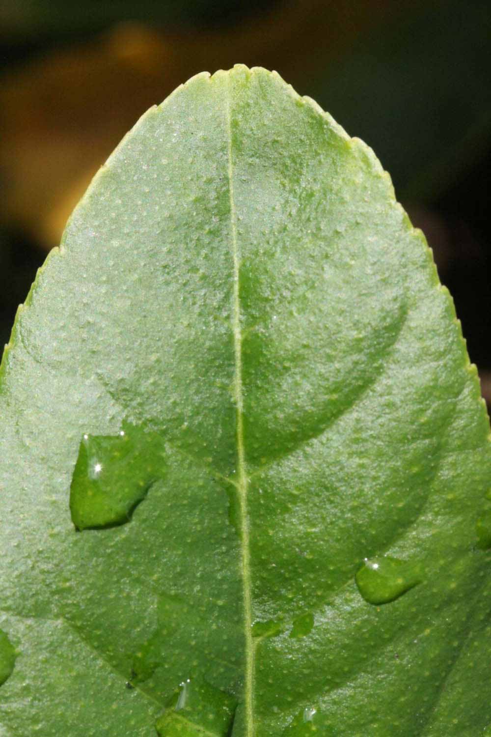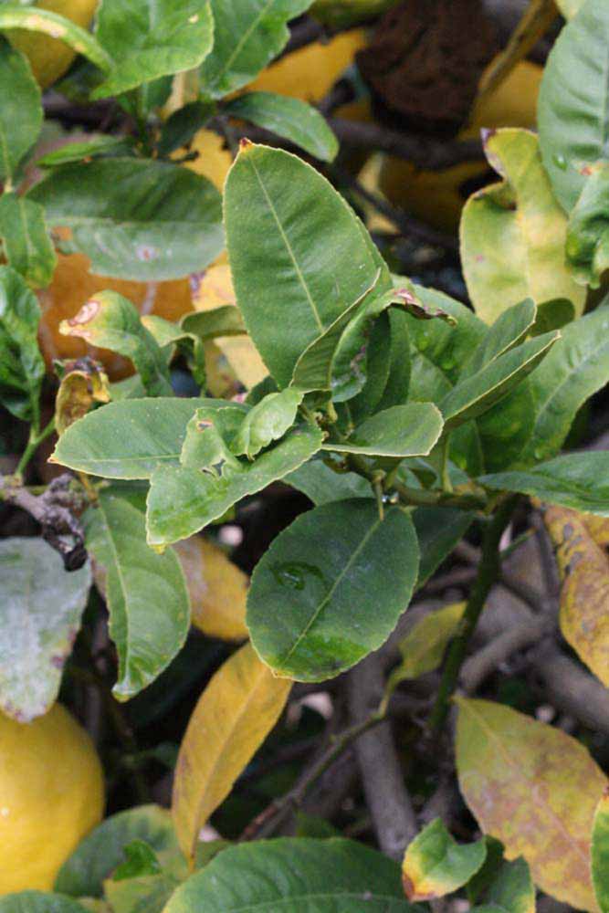Crown compact or dense, not weeping. First-year twig surface glabrous; second- or third-year twig surface mottled; thorns straight; prickles absent or not persistent. Petiole glabrous, length short; wings absent. Leaflets one, margins bluntly toothed or serrate/serrulate, shade leaflet blades flat, sun leaflet blades weakly conduplicate. Scent of crushed leaflets freshly lemon-like. Fruit as broad as long or longer than broad; rind green-yellow (6), yellow (7-10), or yellow-orange (11); rind texture slightly rough (4-5) or medium rough (6-7); firmness leathery; navel absent; flesh yellow; taste sour.