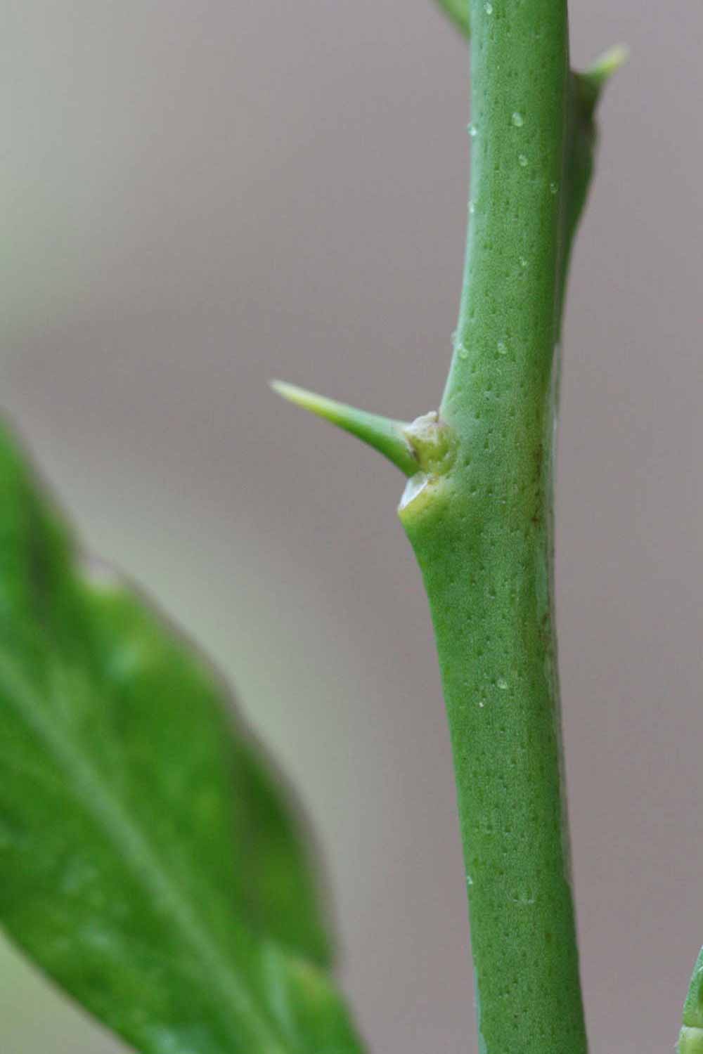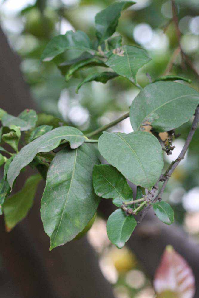Crown compact or dense, not weeping. First-year twig surface glabrous; second- or third-year twig surface striate; thorns straight; prickles absent or not persistent. Petiole glabrous, length short; wings absent. Leaflets one, margin crenate/crenulate or bluntly toothed, shade leaflet blades flat, sun leaflet blades weakly conduplicate. Scent of crushed leaflets freshly lemon-like. Fruit as broad as long or longer than broad; rind green-yellow (6), yellow (7-10), or yellow-orange (11); rind texture slightly rough (4-5); firmness leathery; navel absent; flesh yellow; taste sour.