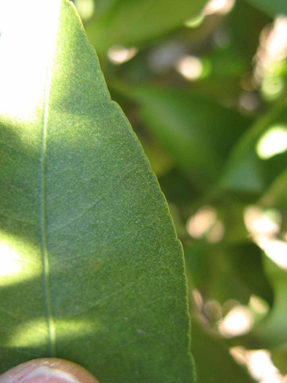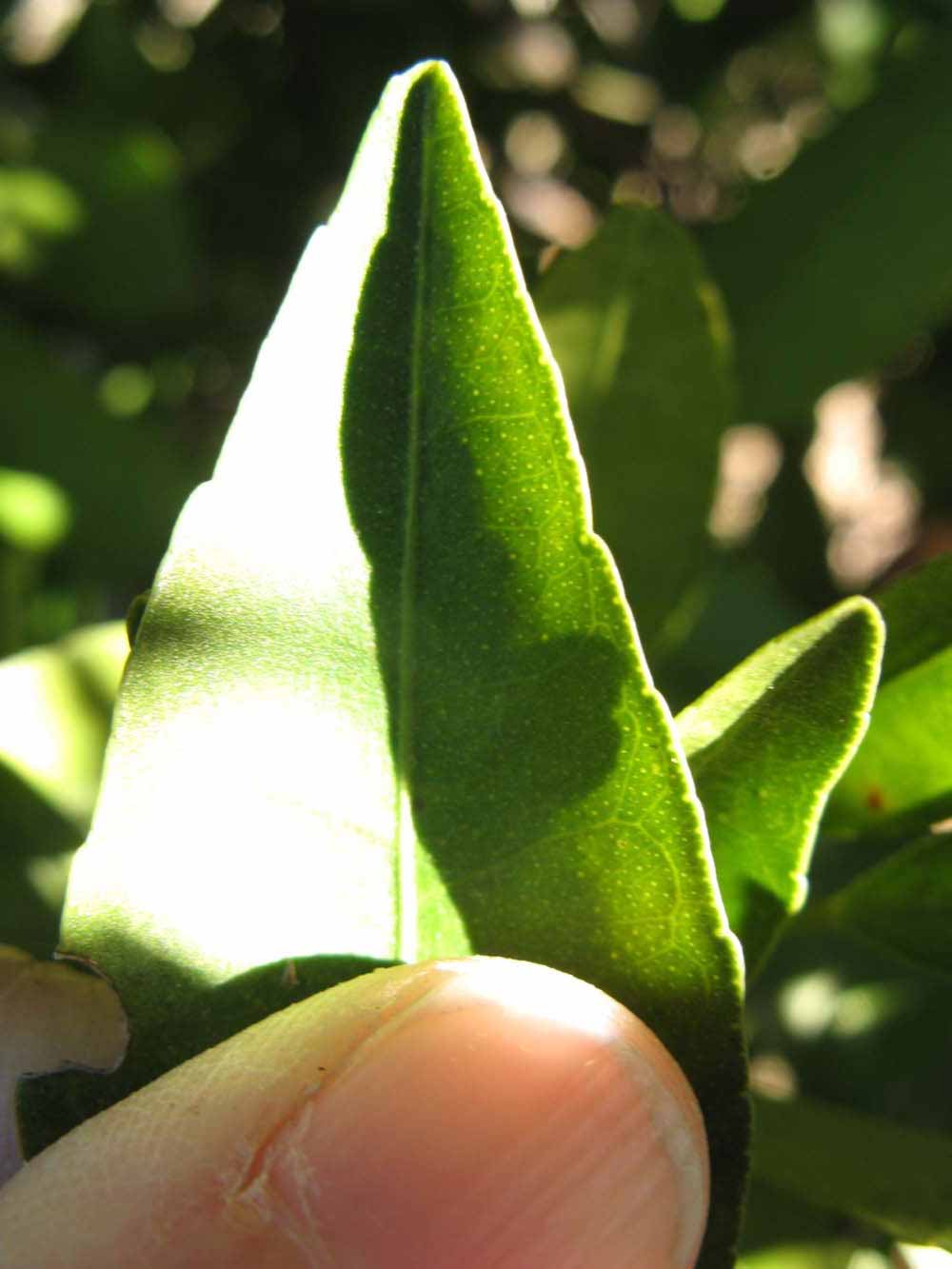 Crown compact or dense, not weeping. First-year twig surface glabrous; second- or third-year twig surface striate; thorns absent or not persistent; prickles absent or not persistent. Petiole glabrous, length medium; wings narrow, adjoining the blade. Leaflets one, margin bluntly toothed, shade leaflet blades weakly conduplicate, sun leaflet blades weakly conduplicate. Scent of crushed leaflets mandarin-like. Fruit broader than long; rind yellow (7-10), yellow-orange (11), orange (12), or red-orange (13); rind texture slightly rough (4-5); firmness leathery; navel absent; flesh orange; taste acidic-sweet.