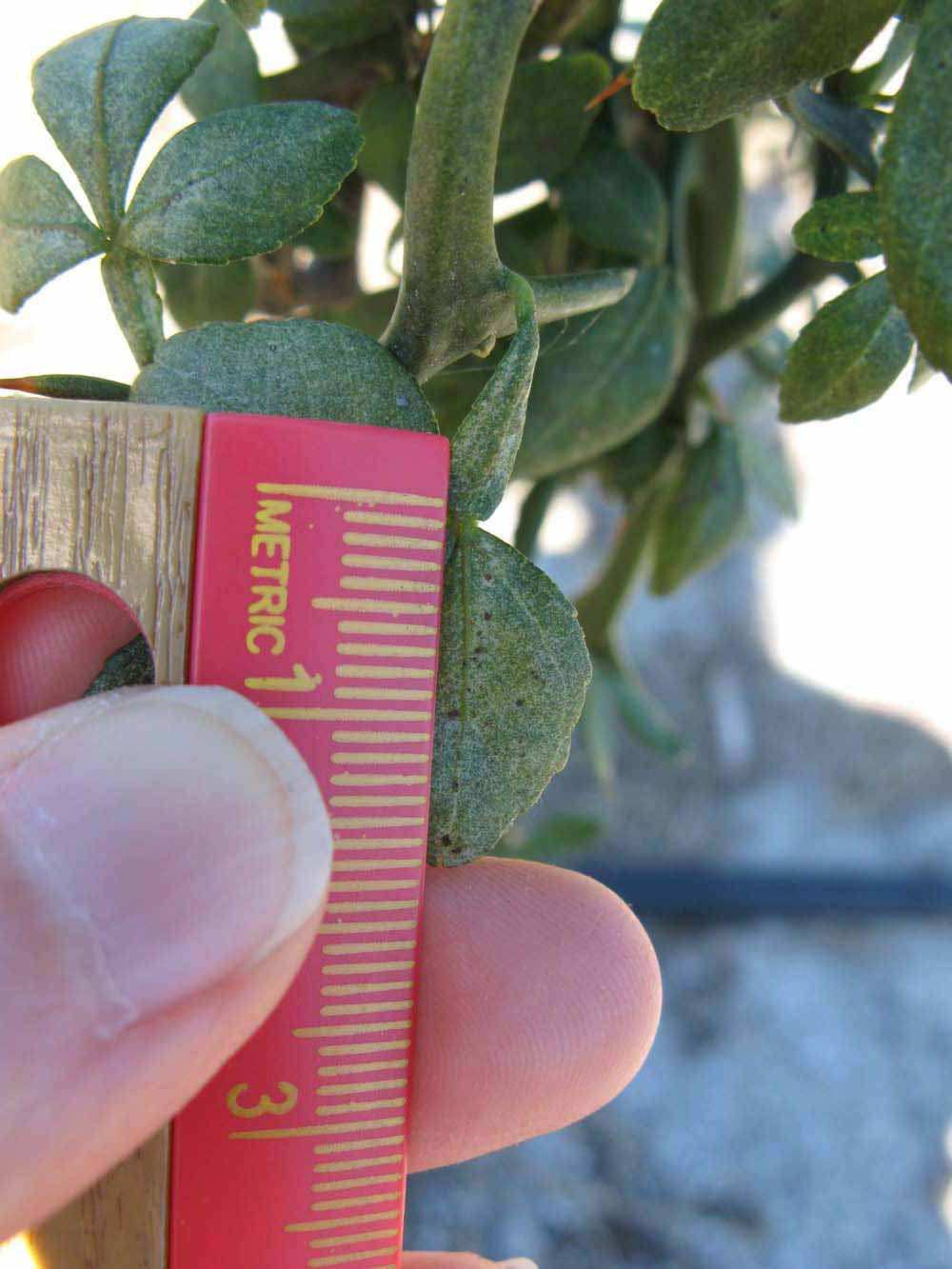 Crown compact or dense, not weeping. First-year twig surface glabrous; second- or third-year twig surface striate; thorns recurved; prickles absent or not persistent. Petiole glabrous, length medium or very long; wings narrow or medium, adjoining the blade. Leaflets three, margin bluntly toothed or serrate/serrulate, rachis wings absent, shade leaflet blades flat, sun leaflet blades flat or weakly conduplicate. Leaflets have no scent when crushed. Fruit broader than long; rind yellow-orange (11), orange (12), or red-orange (13); rind texture slightly rough (4-5) or medium rough (6-7); firmness leathery; navel absent; flesh orange or green/greenish; taste sour.