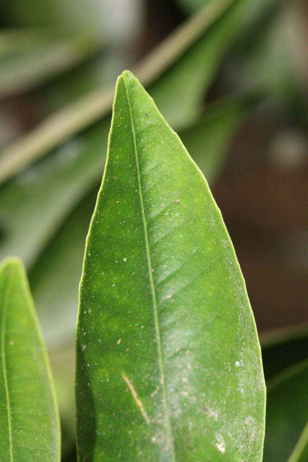 Crown compact or dense, not weeping. First-year twig surface glabrous; second- or third-year twig surface striate; thorns absent or not persistent; prickles absent or not persistent. Petiole glabrous, length medium; wings absent, if present, narrow, adjoining blade. Leaflets one, margin entire (by misinterpretation) or bluntly toothed, shade leaflet blades weakly conduplicate, sun leaflet blades weakly or strongly conduplicate. Scent of crushed leaflets mandarin-like. Fruit broader than long; rind yellow-orange (11); orange (12) or red-orange (13); rind texture slightly rough (4-5); firmness leathery; navel absent; flesh orange; taste acidic-sweet.