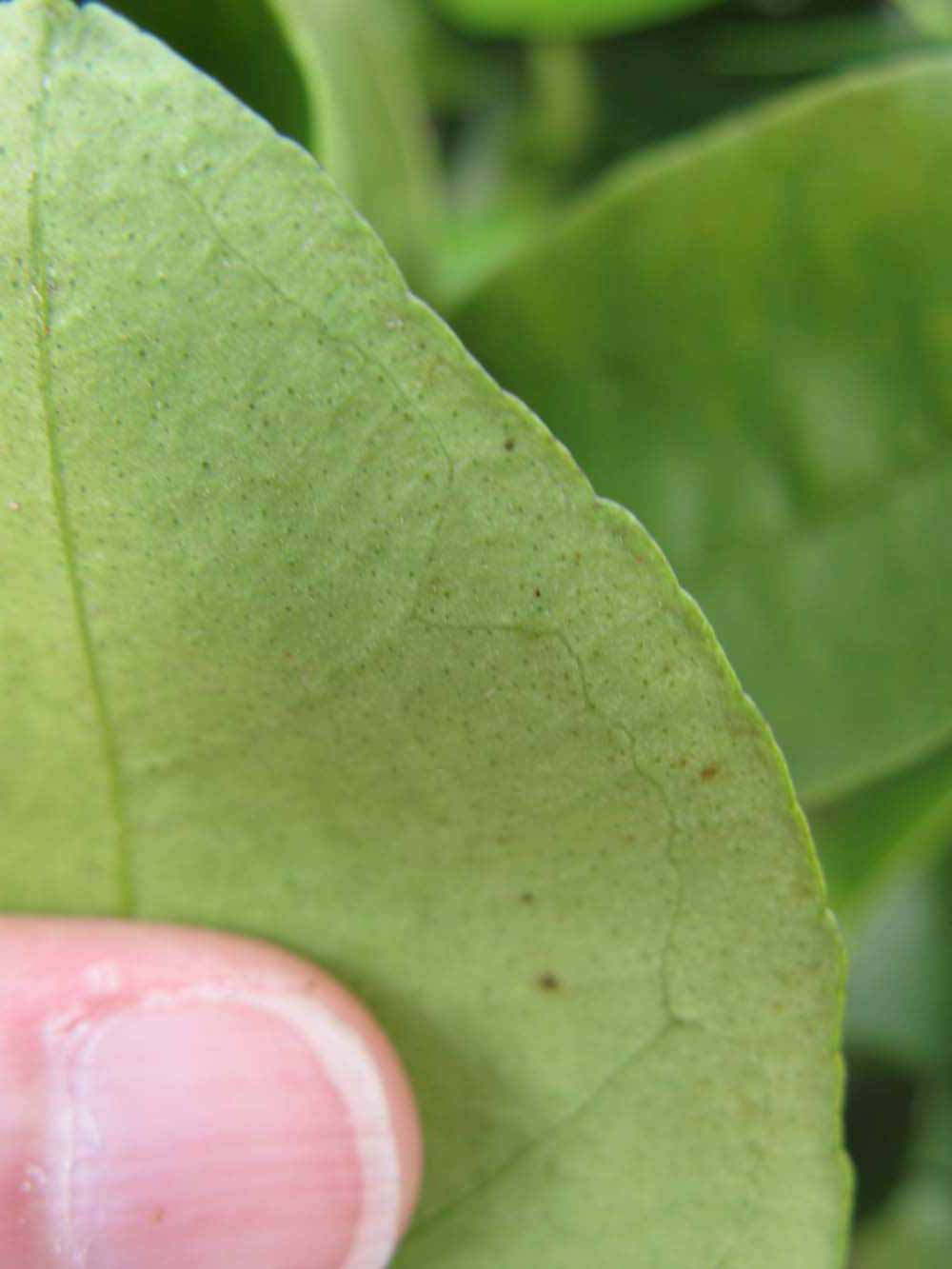 Crown compact or dense, not weeping. First-year twig surface glabrous; second- or third-year twig surface striate; thorns straight; prickles absent or not persistent. Petiole glabrous, length short; wings absent, if present, narrow, adjoining the blade. Leaflets one, margin crenate/crenulate, shade leaflet blades weakly conduplicate, sun leaflet blades weakly or strongly conduplicate. Scent of crushed leaflets sweetly orange-like. Fruit as broad as long or longer than broad; rind green-yellow (6), yellow (7-10), yellow-orange (11), or orange (12); rind texture slightly rough (4-5); firmness leathery; navel absent; flesh orange; taste acidic-sweet.