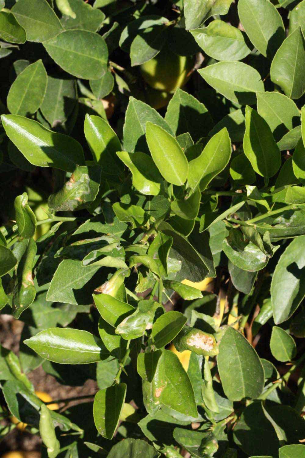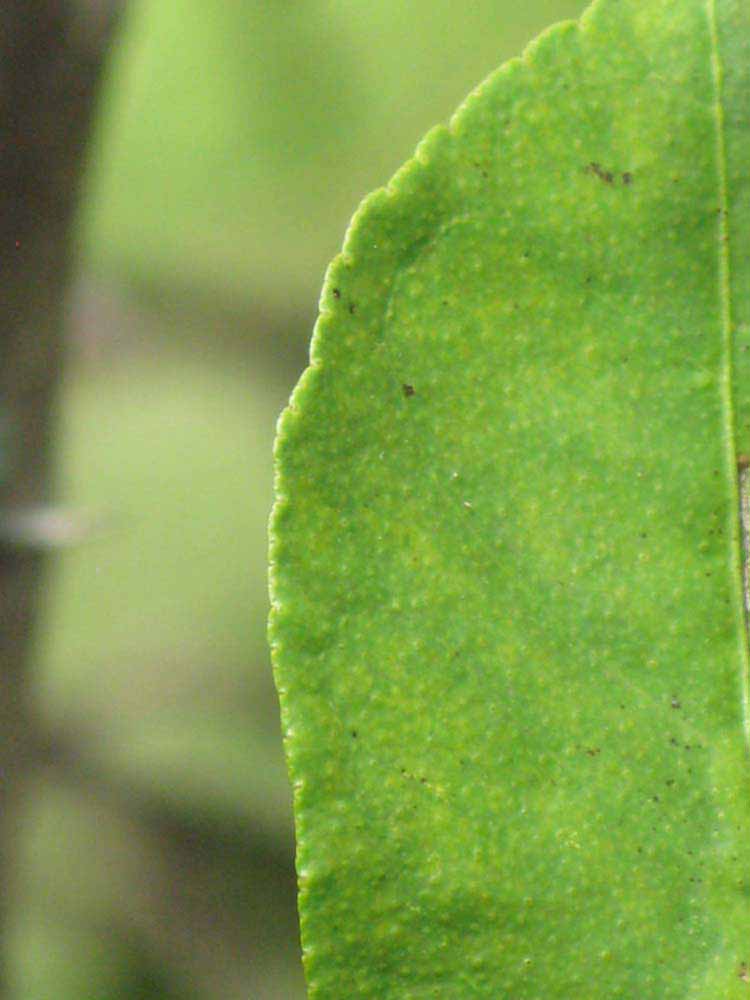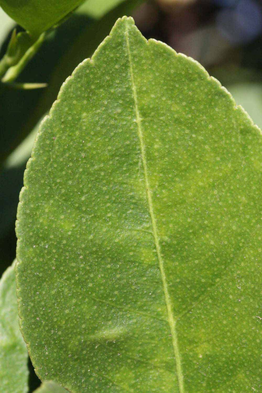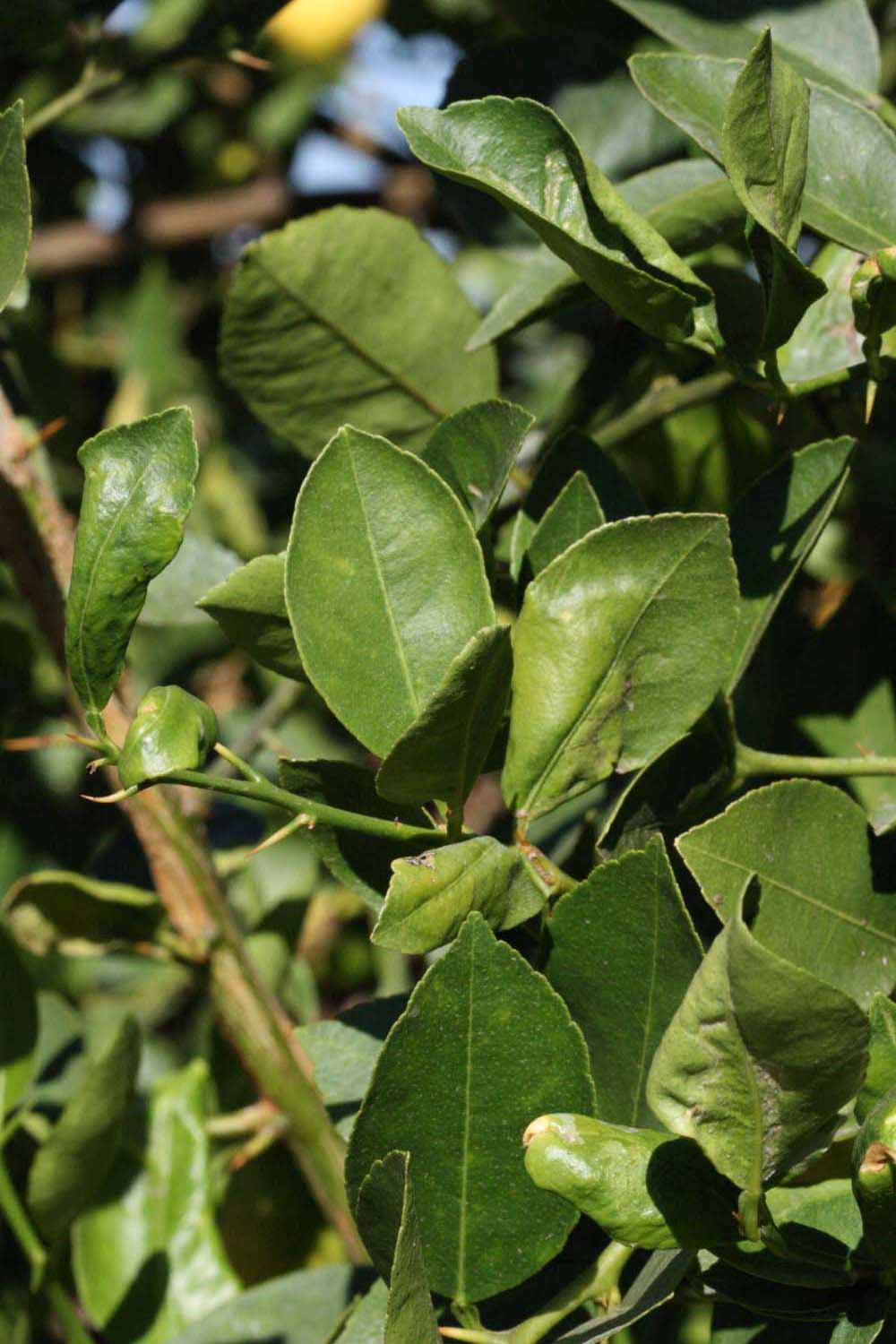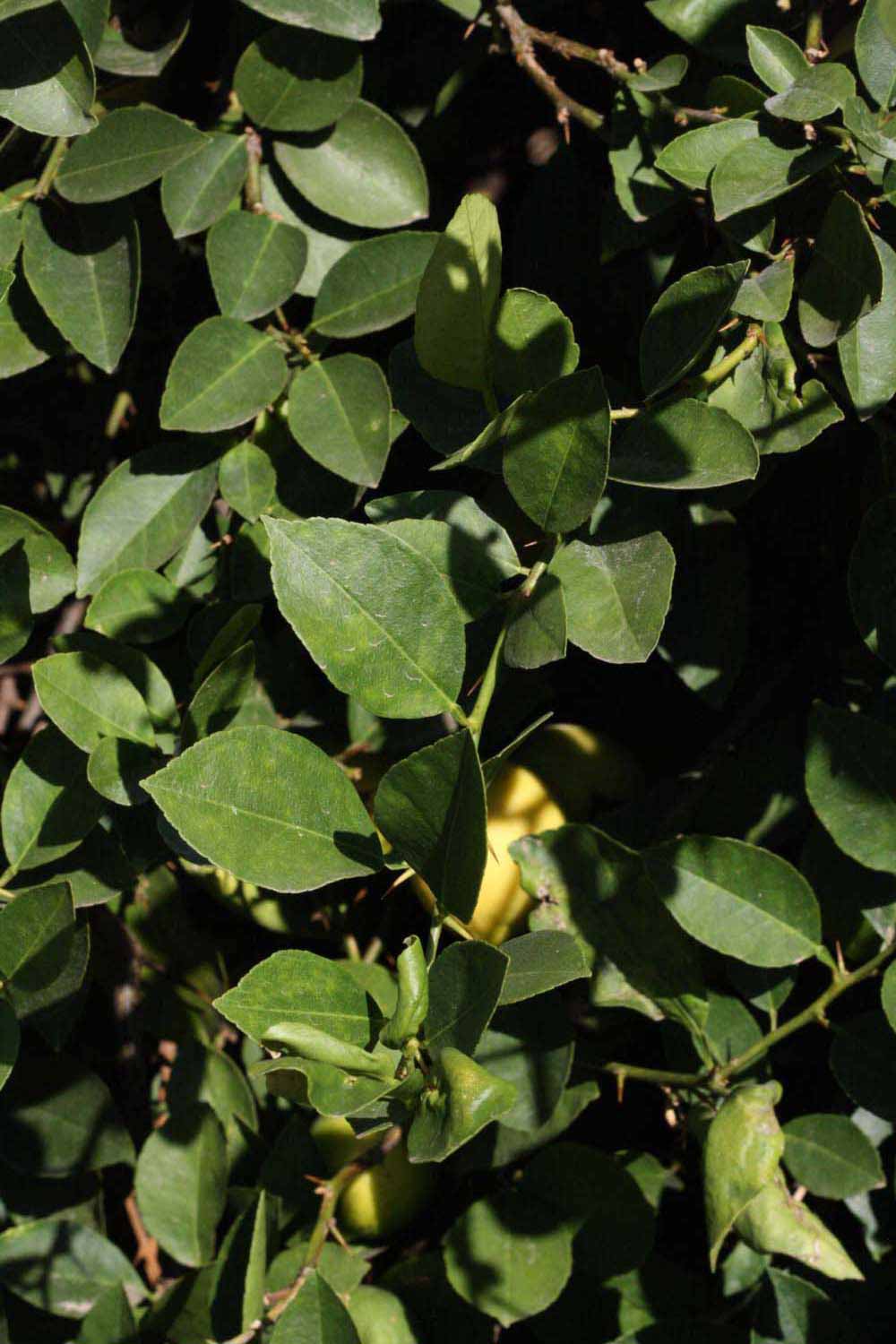 Crown compact or dense, not weeping. First-year twig surface glabrous; second- or third-year twig surface striate; thorns straight; prickles absent or not persistent. Petiole glabrous, length medium; wings narrow, adjoining the blade. Leaflets one, margin crenate/crenulate, bluntly toothed or serrate/serrulate, shade leaflet blades weakly conduplicate, sun leaflet blades weakly conduplicate. Scent of crushed leaflets freshly lemon-like. Fruit as broad as long or longer than broad; rind green-yellow (6), yellow (7-10), or yellow-orange (11); rind texture slightly rough (4-5) or medium rough (6-7); firmness leathery; navel absent; flesh green/greenish or yellow; taste sour.