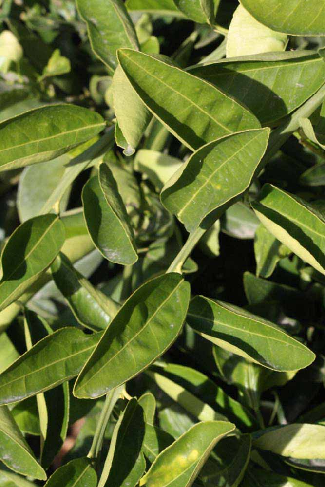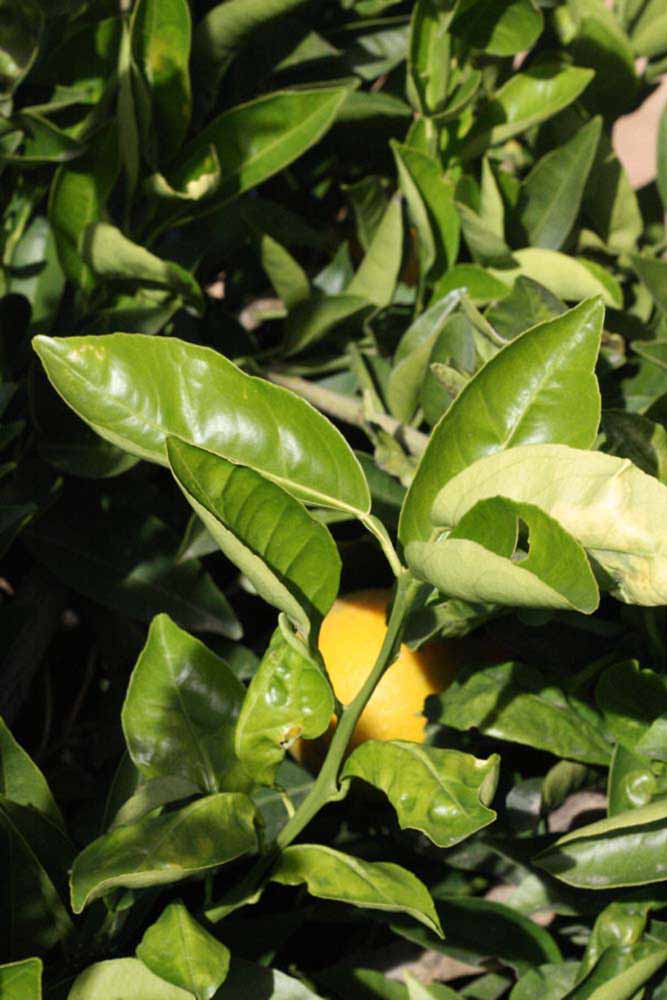 Crown compact or dense, not weeping. First-year twig surface glabrous; second- or third-year twig surface striate; thorns absent or not persistent; prickles absent or not persistent. Petiole glabrous, length medium; wings absent. Leaflets one, margin bluntly toothed, shade leaflet blades weakly conduplicate, sun leaflet blades weakly or strongly conduplicate. Scent of crushed leaflets sweetly orange-like. Fruit as broad as long or longer than broad; rind yellow (7-10), yellow-orange (11), orange (12), or red-orange (13); rind texture slightly rough (4-5); firmness leathery; navel present; flesh orange; taste acidic-sweet.