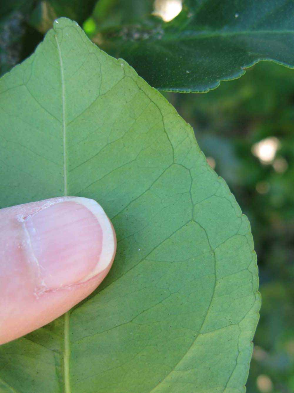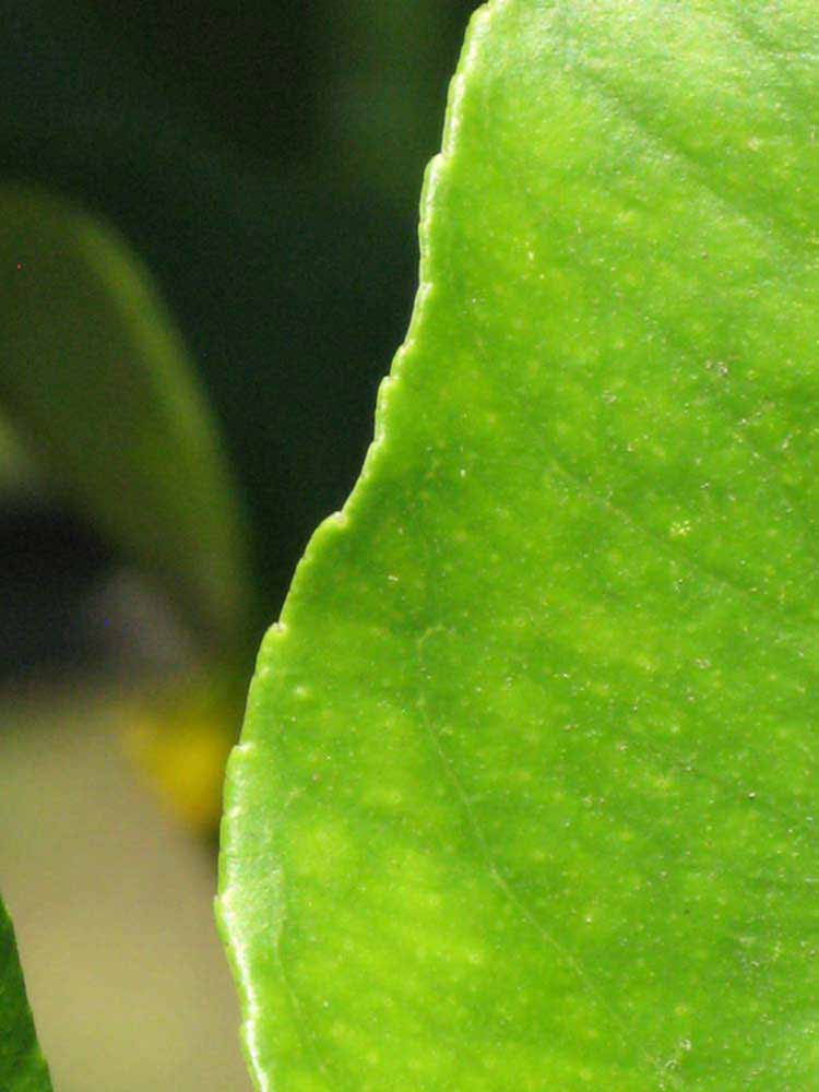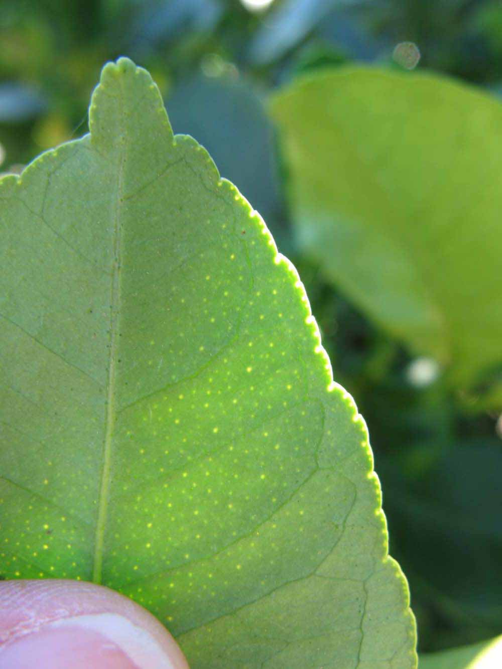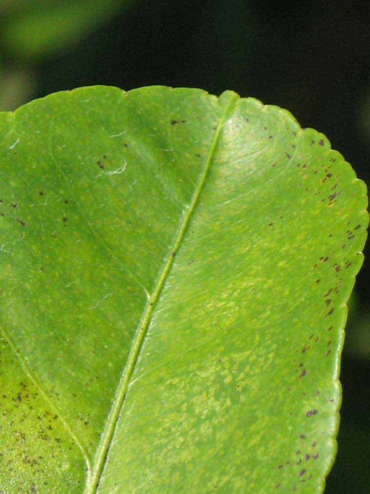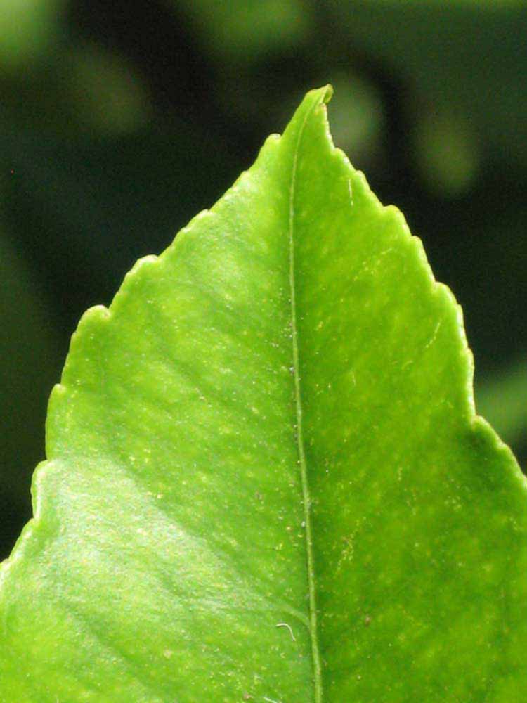 Crown compact or dense, not weeping. First-year twig surface glabrous; second- or third-year twig surface striate; thorns absent or not persistent; prickles absent or not persistent. Petiole glabrous, length short; wings absent. Leaflets one, margin crenate/crenulate, bluntly toothed or serrate/serrulate, shade leaflet blades flat or weakly conduplicate, sun leaflet blades flat or weakly conduplicate. Scent of crushed leaflets freshly lemon-like. Fruit broader than long; rind green-yellow (6), yellow (7-10), yellow-orange (11), or orange (12); rind texture slightly rough (4-5); firmness leathery; navel absent; flesh yellow; taste sour.