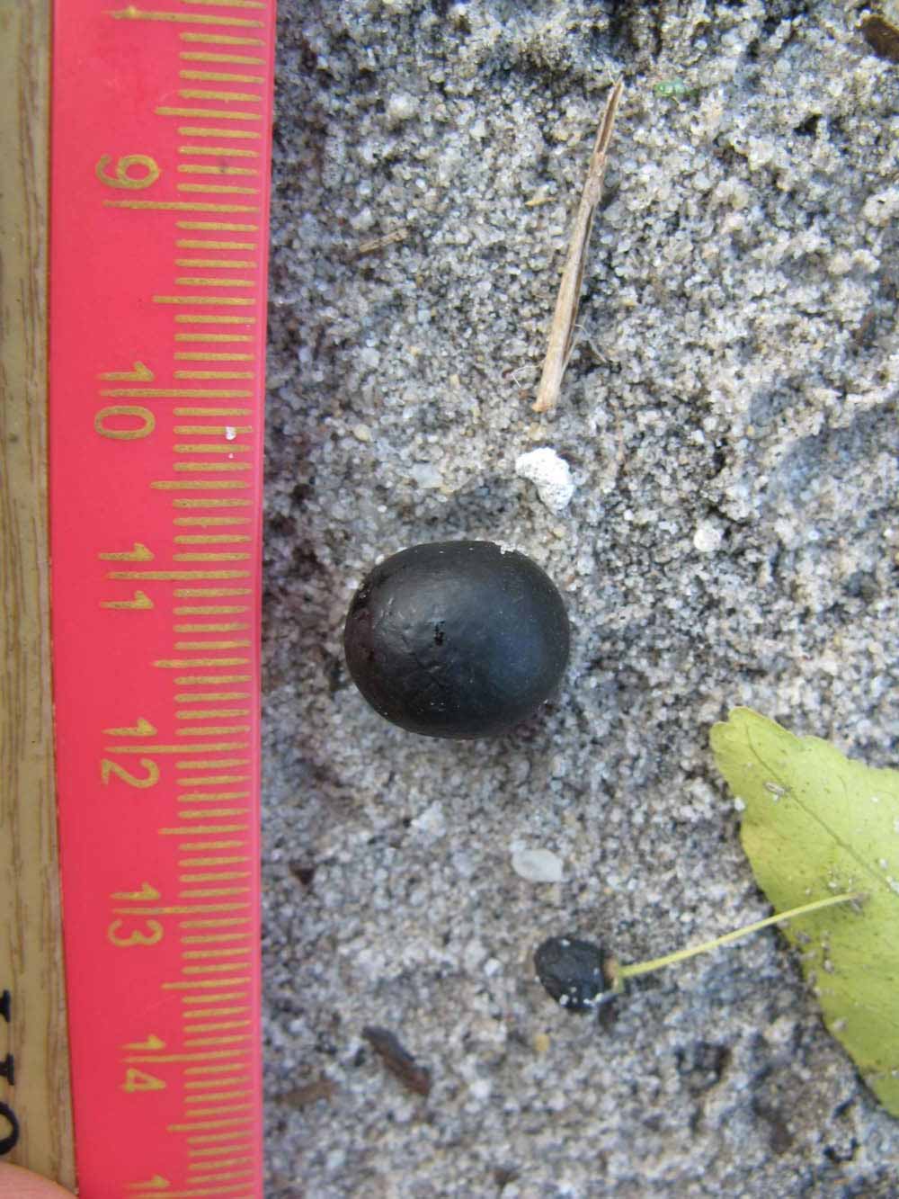 Crown compact or dense, not weeping. First-year twig surface glabrous; second- or third-year twig surface mottled; thorns straight; prickles absent or not persistent. Petiole glabrous, length medium or long; wings narrow, adjoining the blade. Leaflets five to seven, margin crenate/crenulate or serrate/serrulate, rachis wings wide, shade leaflet blades flat or weakly conduplicate, sun leaflet blades flat or weakly conduplicate. Leaflets not scented when crushed. Fruit as broad as long or longer than broad; rind black; rind texture smooth (1-3); firmness membranous; navel absent; flesh red/purplish-tinged.