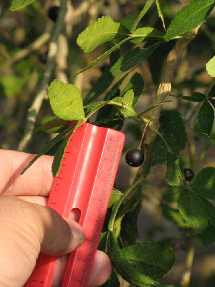 "Talbot (1909, pp. 198, 199) described this species as follows: "A spinous, glabrous, small tree: spines straight 0.5"-1" [12-25 mm] long. Leaves imparipinnate; leaflets 2-3 pairs, 1"-2" [2.5-5.1 cm] by 0.5"-1" [1.2-2.5 cm], conspicuously gland-dotted, sessile, ovate, emarginate, crenulate; terminal leaflet usually largest; rachis and petiole broadly winged, jointed; joints of rachis obovate. Racemes short, axillary, pubescent, subumbellate, few-flowered. Flowers 4-merous. Calyx small, glandular, 4-lobed; lobes ovate. Petals 4, fragrant, white, 0.25" [6 mm] long, elliptic. Disk annular or stipitate. Ovary 4-celled with 1 pendulous ovule in each cell; style short. Fruit globose, 1-4 seeded, 0.25" [6 mm] in diameter, black when ripe; pedicels 0.75" [19 mm] long."