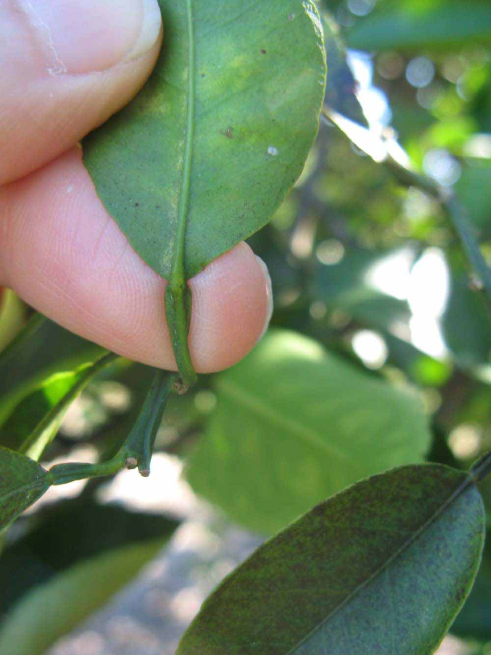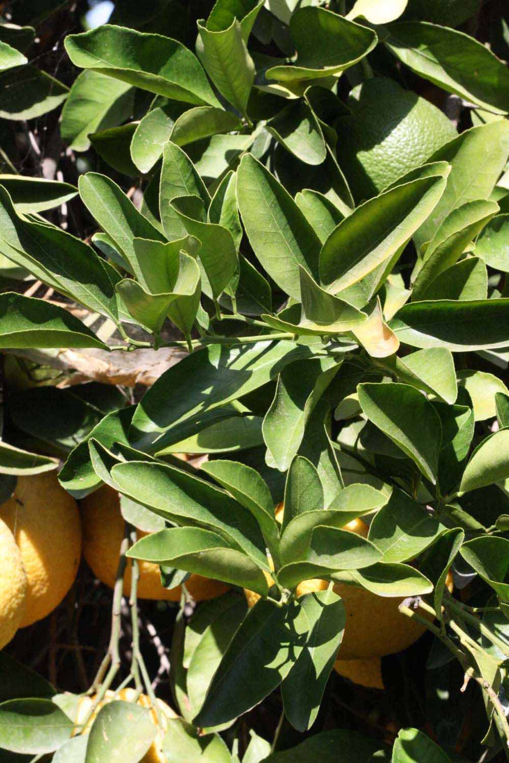 Crown compact or dense, not weeping. First-year twig surface glabrous; second- or third-year twig surface striate; thorns absent or not persistent, prickles absent or not persistent. Petiole glabrous, length short or medium; wings narrow, adjoining the blade. Leaflets one, margins crenate/crenulate or bluntly toothed, shade leaflet blades weakly conduplicate, sun leaflet blades weakly or strongly conduplicate. Scent of crushed leaflets freshly lemon-like. Fruit as broad as long or longer than broad; rind green-yellow (6), yellow (7-10), yellow-orange (11), or orange (12); rind texture slightly rough (4-5) or medium rough (6-7); firmness leather; navel absent; flesh orange or yellow; taste grapefruit-like or sour.