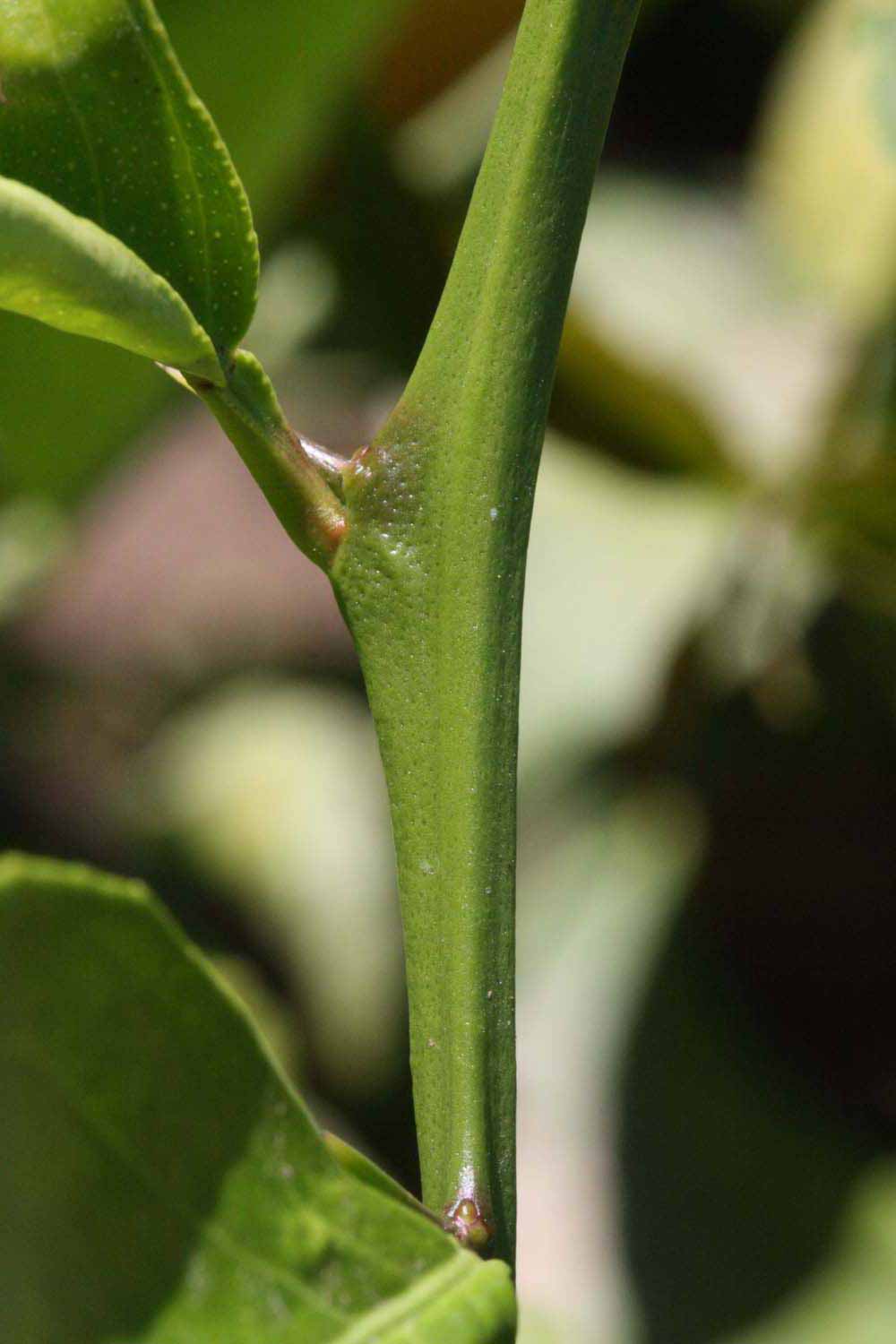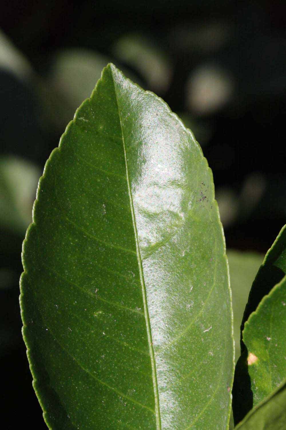 Crown compact or dense, not weeping. First-year twig surface glabrous; second- or third-year twig surface striate; thorns absent or not persistent, prickles absent or not persistent. Petiole glabrous, length short; wings absent. Leaflets one, margin bluntly toothed, shade leaflet blades weakly conduplicate, sun leaflet blades weakly conduplicate. Scent of crushed leaflets freshly lemon-like. Fruit as broad as long or longer than broad; rind yellow (7-10), yellow-orange (11), orange (12), or red-orange (13); rind texture smooth (1-3) or slightly rough (4-5); firmness leathery; navel absent; flesh yellow; taste sour.